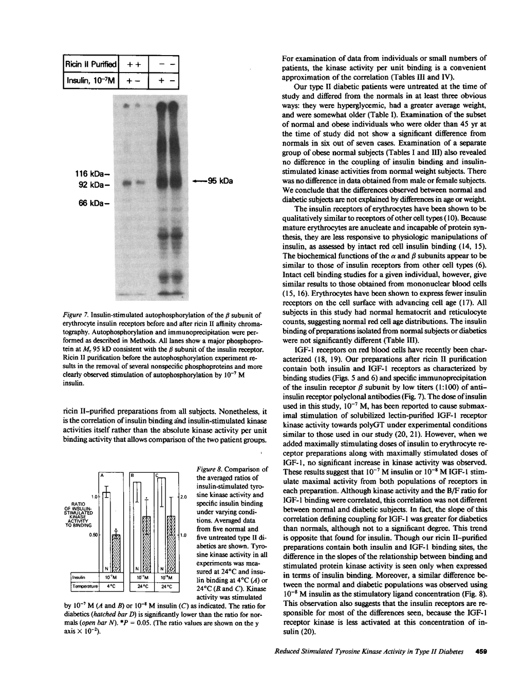 The insulin receptor contains an alpha subunit with insulin binding properties and a beta subunit with insulin-stimulated tyrosine kinase function. Preparations containing insulin and insulinlike growth factor I (IGF-I) receptors were obtained from solubilized human red cell membranes by affinity chromatography. After separate assays for insulin binding and insulin-stimulated tyrosine kinase activities, a high degree of correlation was found between these activities in preparations from normals and diabetics. Identical studies using IGF-I as the ligand showed a lesser degree of correlation. We compared 24 normal subjects and 14 untreated type II diabetics and found significant diminution in the slope of the line coupling insulin binding and insulin-stimulated kinase activities in the diabetics. This difference was not observed in a similar study of IGF-I-related activities. Compared to normal controls, untreated type II diabetics have reduced tyrosine kinase activity stimulated per unit insulin binding.