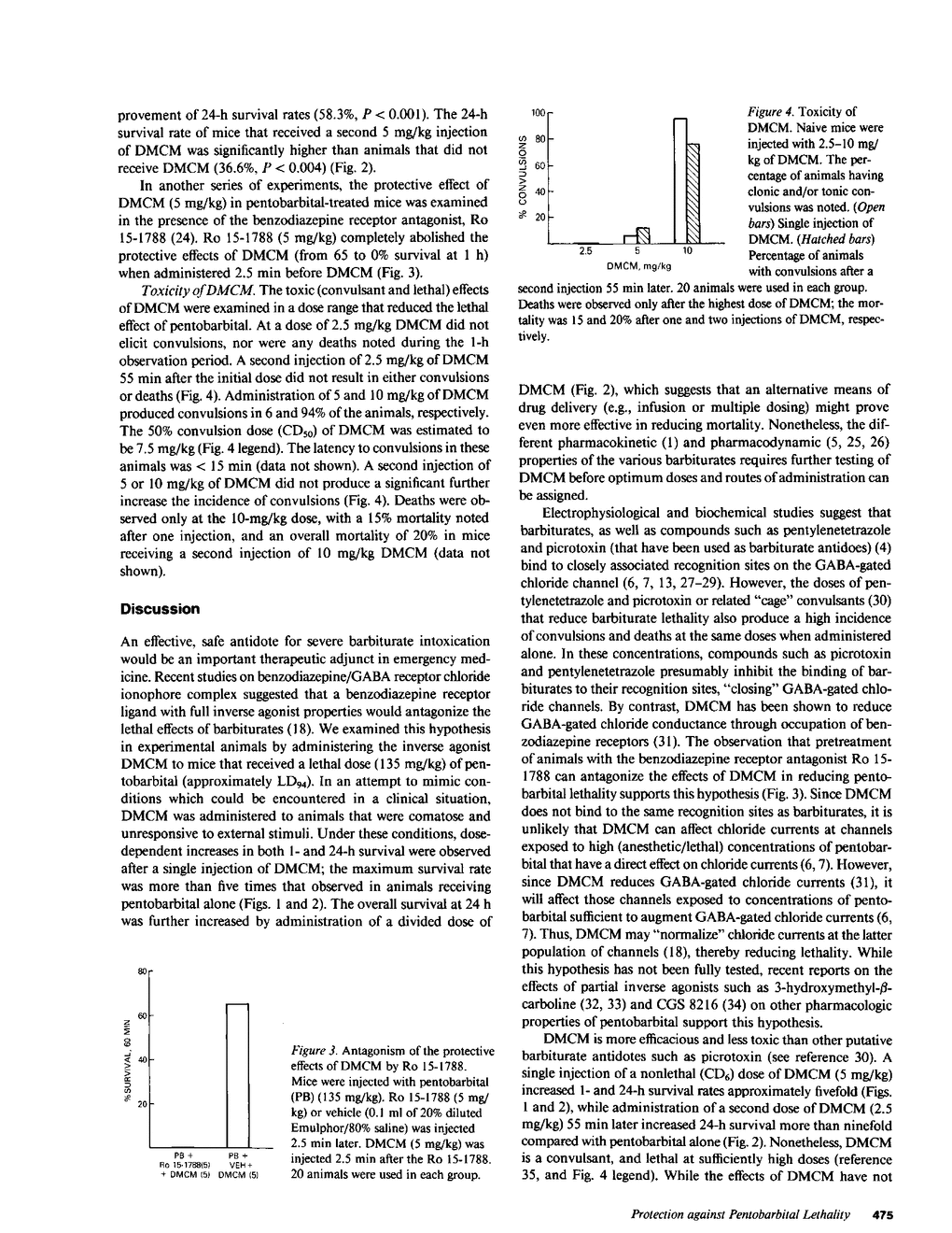 The benzodiazepine receptor inverse agonist 6,7-dimethoxy-4-ethyl-3-carbomethoxy-beta-carboline (DMCM) (1.5-15 mg/kg) was administered to mice 5 min after a lethal (LD94) injection of pentobarbital. DMCM (1.5-5 mg/kg) increased short-term (1 h) survival in a dose-dependent fashion, with an optimum survival rate more than five times greater than mice receiving pentobarbital alone. Statistically significant increases in long-term (24 h) survival were also observed after both 5 and 10 mg/kg of DMCM (34 and 33%, respectively) compared with animals receiving pentobarbital alone (6%). Two doses of DMCM (5 and 2.5 mg/kg, respectively) administered 55 min apart produced an even greater increase (58%) in 24-h survival rates. Doses of DMCM that increased 1- and 24-h survival were not lethal when administered alone, and were below the dose that produced convulsions in 50% (CD50) of the animals. The protective effects of DMCM were blocked by pretreatment with the benzodiazepine receptor agonist ethyl-8-fluoro-5,6-dihydro-5-methyl-6-oxo- 4H-imidazo[1,5a][1,4]benzodiazodiazepine-3-carboxylate (Ro 15-1788), which suggests the effects of DMCM are mediated through the benzodiazepine receptor. These findings suggest that DMCM or another benzodiazepine receptor ligand with full inverse agonist qualities could prove effective as an antidote for barbiturate intoxication in man.