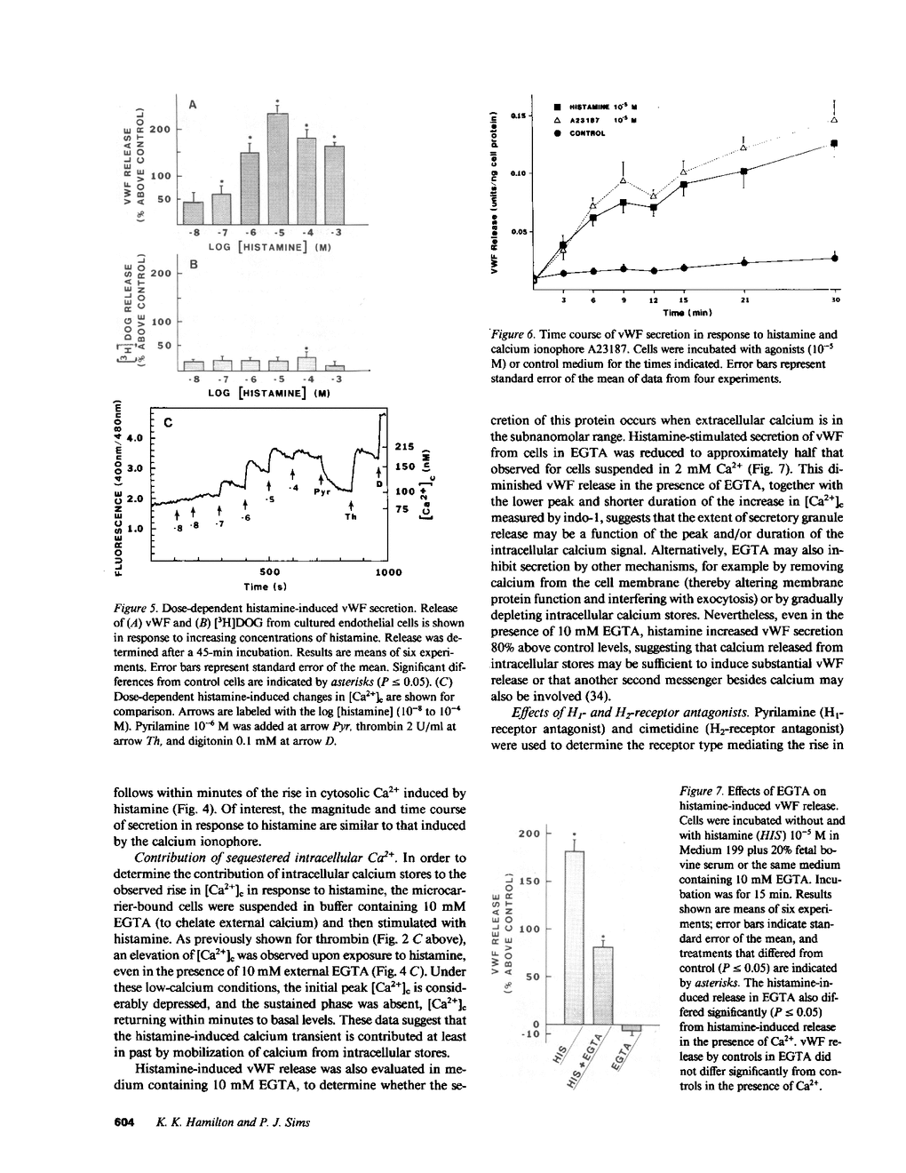 A method for measuring fluorescence in anchored monolayers of human endothelial cells is described and used to demonstrate changes in the cytosolic free-calcium concentration ([Ca2+]c) in these cells exposed to histamine and thrombin; some endothelial responses to both agonists (e.g., mitogenesis) have been suggested to be Ca2+-mediated. Umbilical vein endothelial cells were cultured on microcarriers and loaded with the Ca2+ indicator, indo-1. Enzymatic cell detachment was avoided by monitoring the indo-1 fluorescence ratio (400/480 nm) of a stirred suspension of cell-covered microcarriers. Basal [Ca2+]c was estimated to be 70-80 nM. Thrombin induced a transient dose-dependent increase in [Ca2+]c, which was active-site dependent. Histamine stimulated a dose-dependent increase in [Ca2+]c, which was reversed by removal of histamine and inhibited competitively by the H1-receptor antagonist pyrilamine, but not by the H2-receptor antagonist cimetidine. Furthermore, histamine induced a dose-dependent secretion of von Willebrand factor, which paralleled the rise in [Ca2+]c and was similarly blocked by the H1-receptor antagonist, and which may contribute to platelet deposition at sites of inflammation.