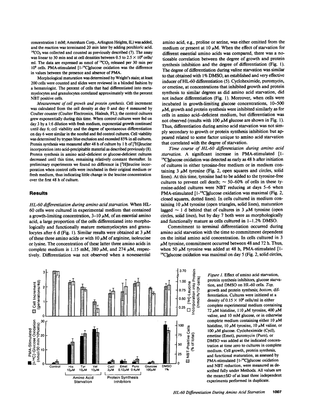 Starvation for a single essential amino acid induced differentiation of the human promyelocytic leukemia line HL-60 into morphologically and functionally mature granulocytes. Differentiation occurred when protein synthesis was inhibited up to 90% but was not simply secondary to growth arrest or protein synthesis inhibition, because neither glucose starvation nor treatment with protein synthesis inhibitors induced differentiation. Induction of differentiation by an aminoacyl tRNA synthetase inhibitor and the effect of cycloheximide and puromycin on amino acid-starved cells suggested an important regulatory role of tRNA molecules during differentiation.