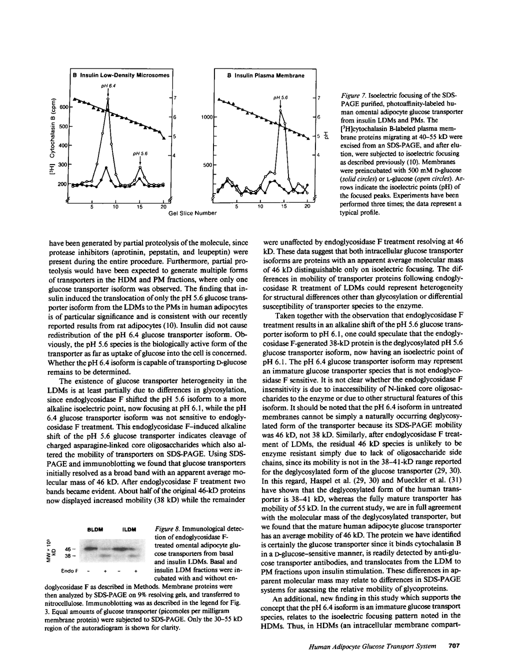 We have investigated glucose transport proteins in isolated human adipocytes. Using the cytochalasin B binding assay to measure glucose transporters in subcellular membrane subfractions, we found that insulin induced translocation of intracellular glucose transporters to the cell surface. Isoelectric focusing of glucose transporters photolabeled with [3H]cytochalasin B revealed two distinct glucose transporter isoforms in low density microsomes focusing at pH 5.6 and pH 6.4, but only the pH 5.6 isoform was detectable in plasma membranes and only the pH 6.4 form was found in the high density microsomes. Insulin recruited only the pH 5.6 glucose transporter from the low density microsomes to the plasma membrane with no effect on the pH 6.4 transporter isoform. The results suggest that the pH 6.4 species is an immature form of the glucose transporter initially located in the high-density microsome fraction, which then migrates to the low-density microsomes where it matures (converted to pH 5.6 species) and becomes available for insulin-mediated recruitment to the plasma membrane.