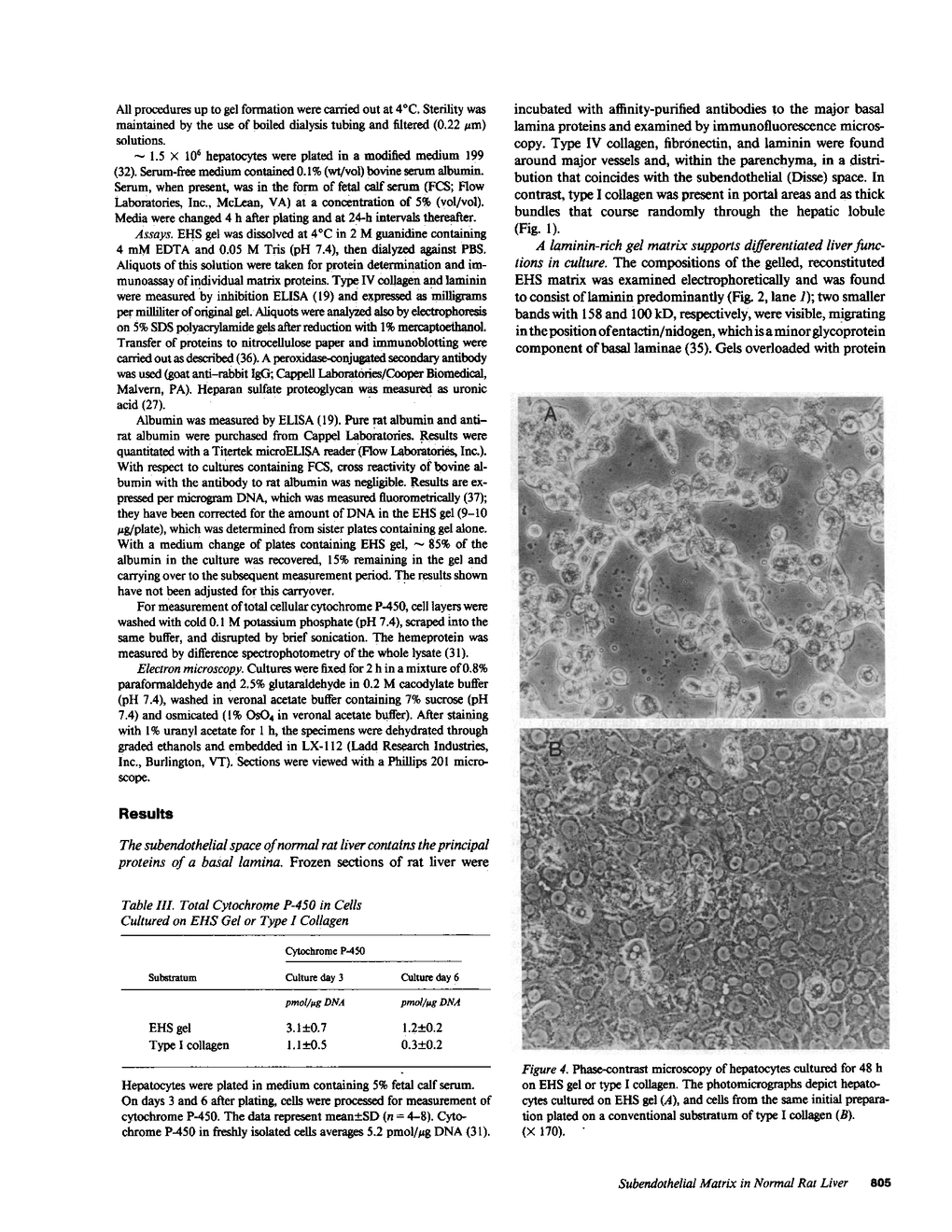 The subendothelial space of normal rat liver contains the constituent proteins of a basal lamina, as judged by immunohistochemical study of tissue sections. However, it is unknown whether these proteins constitute a complex with effects on hepatocellular function. We have examined this question, using normal rat hepatocytes cultured on substrata of matrix proteins as a model of the interaction between cells and basal lamina in vivo. In cultures on a type I collagen substratum, albumin secretion decreased progressively after 2 d. By contrast, when cells were cultured on a laminin-rich gel matrix, albumin secretion was stable for at least 3 wk; other functions and ultrastructural morphology were similarly maintained. None of the individual matrix proteins effectively substituted for the gel matrix, suggesting that full support of hepatocellular function requires a complex of matrix proteins. We speculate that a cause of hepatocellular dysfunction in acute inflammation is disruption of this matrix and alteration of its interaction with the hepatocyte plasma membrane.