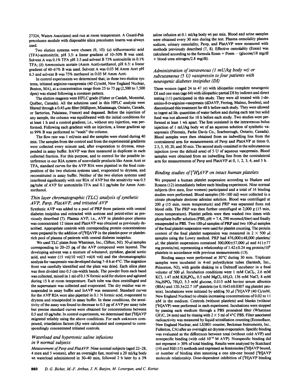 Arginine-vasopressin (AVP) immunoreactivity (Ir) has been found to be elevated in platelet-rich plasma. PlatAVP was defined as platelet-rich plasma Ir minus platelet-poor plasma Ir (Pavp). PlatAVP, Pavp, and synthetic AVP were found to have identical retention time on high performance liquid chromatography analysis and similar mobility on thin-layer chromatography. During a standard osmotic suppression-stimulation test, Pavp increased with plasma osmolality (Posm, mosmol/kg H2O); Pavp (pg/ml) = 0.98 (Posm -274.4), r = 0.57, P less than 0.001, n = 65; but PlatAVP was not significantly correlated with Posm and remained at 5 pg/ml. This PlatAVP concentration was estimated to represent a true intraplatelet AVP concentration of 0.4 to 3.7 X 10(-9) M. Binding studies on intact human platelets demonstrated specific binding sites for [3H]AVP (n = 16; BMax = 98 +/- 30 binding sites/platelet; Kd = 0.72 +/- 0.24 nM). This in vitro affinity association constant (Kd) was close to the estimated in vivo intraplatelet AVP concentration. Measurement of PlatAVP could estimate vasopressin bound to a specific platelet receptor.
