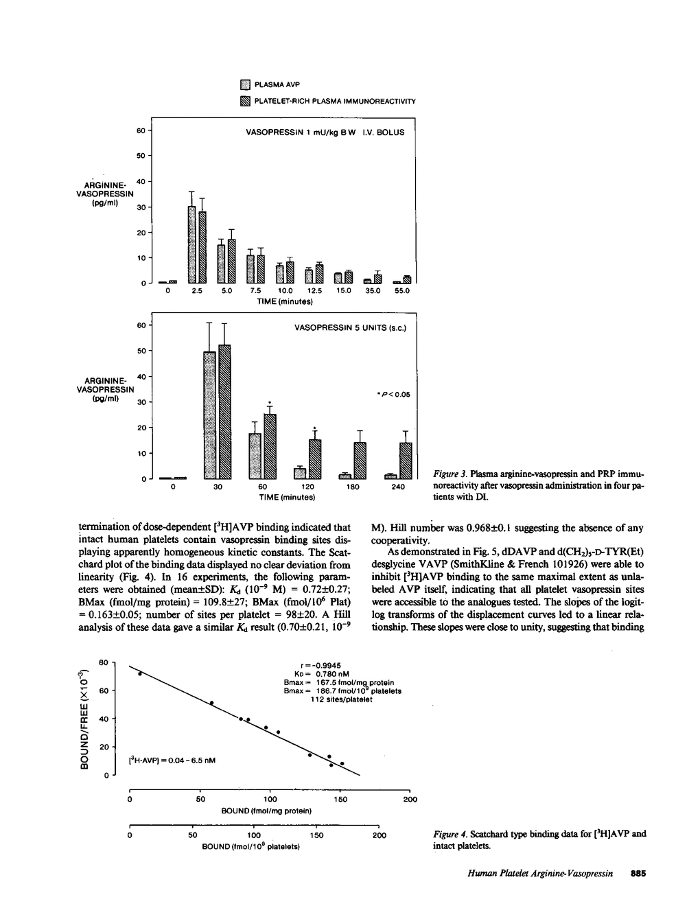 Arginine-vasopressin (AVP) immunoreactivity (Ir) has been found to be elevated in platelet-rich plasma. PlatAVP was defined as platelet-rich plasma Ir minus platelet-poor plasma Ir (Pavp). PlatAVP, Pavp, and synthetic AVP were found to have identical retention time on high performance liquid chromatography analysis and similar mobility on thin-layer chromatography. During a standard osmotic suppression-stimulation test, Pavp increased with plasma osmolality (Posm, mosmol/kg H2O); Pavp (pg/ml) = 0.98 (Posm -274.4), r = 0.57, P less than 0.001, n = 65; but PlatAVP was not significantly correlated with Posm and remained at 5 pg/ml. This PlatAVP concentration was estimated to represent a true intraplatelet AVP concentration of 0.4 to 3.7 X 10(-9) M. Binding studies on intact human platelets demonstrated specific binding sites for [3H]AVP (n = 16; BMax = 98 +/- 30 binding sites/platelet; Kd = 0.72 +/- 0.24 nM). This in vitro affinity association constant (Kd) was close to the estimated in vivo intraplatelet AVP concentration. Measurement of PlatAVP could estimate vasopressin bound to a specific platelet receptor.