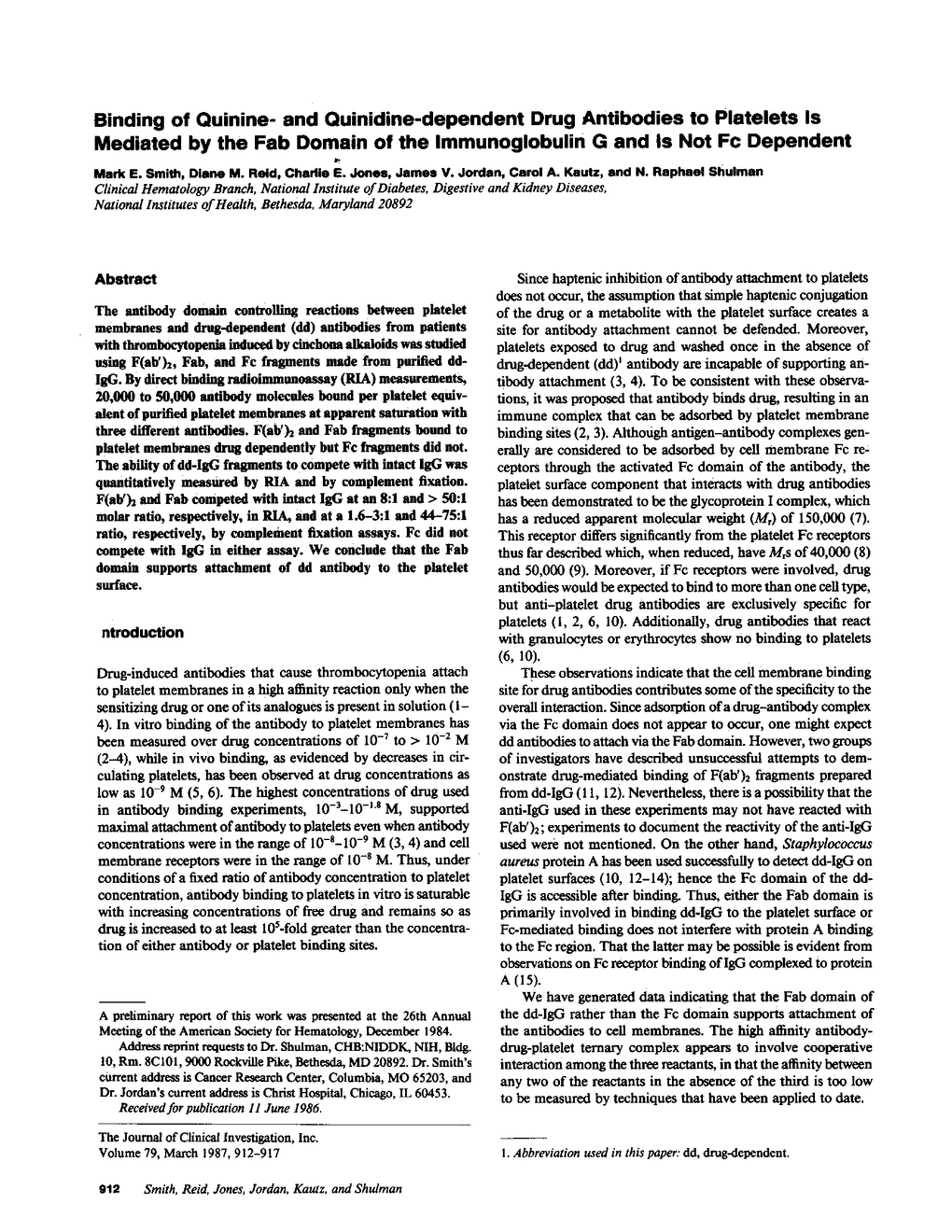 The antibody domain controlling reactions between platelet membranes and drug-dependent (dd) antibodies from patients with thrombocytopenia induced by cinchona alkaloids was studied using F(ab')2, Fab, and Fc fragments made from purified dd-IgG. By direct binding radioimmunoassay (RIA) measurements, 20,000 to 50,000 antibody molecules bound per platelet equivalent of purified platelet membranes at apparent saturation with three different antibodies. F(ab')2 and Fab fragments bound to platelet membranes drug dependently but Fc fragments did not. The ability of dd-IgG fragments to compete with intact IgG was quantitatively measured by RIA and by complement fixation. F(ab')2 and Fab competed with intact IgG at an 8:1 and greater than 50:1 molar ratio, respectively, in RIA, and at a 1.6-3:1 and 44-75:1 ratio, respectively, by complement fixation assays. Fc did not compete with IgG in either assay. We conclude that the Fab domain supports attachment of dd antibody to the platelet surface.