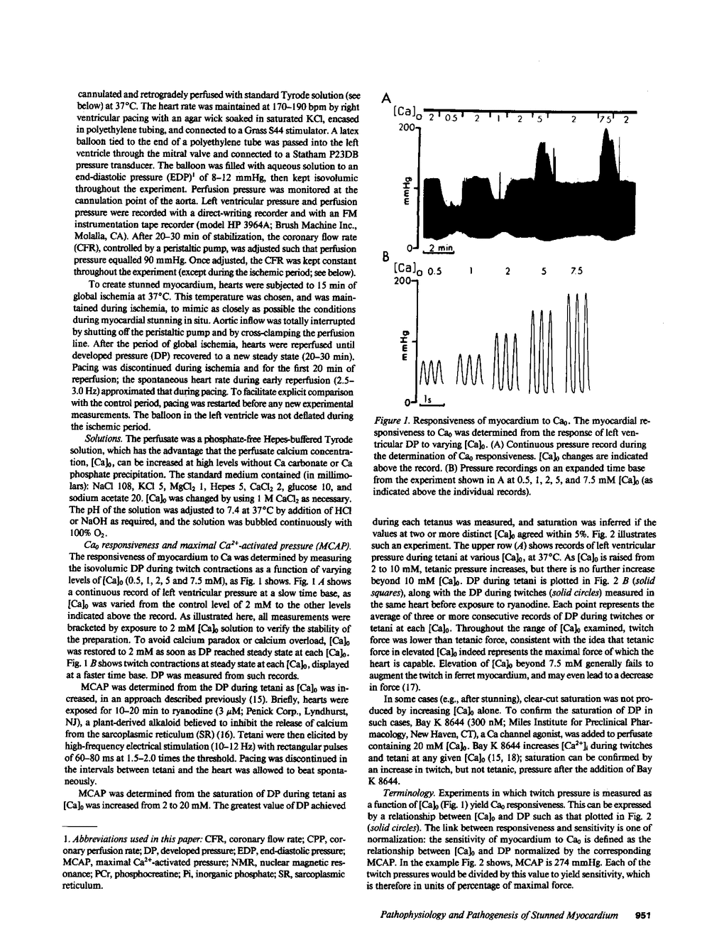 Contractile dysfunction in stunned myocardium could result from a decrease in the intracellular free [Ca2+] transient during each beat, a decrease in maximal Ca2+-activated force, or a shift in myofilament Ca2+ sensitivity. We measured developed pressure (DP) at several [Ca]0 (0.5-7.5 mM) in isovolumic Langendorff-perfused ferret hearts at 37 degrees C after 15 min of global ischemia (stunned group, n = 13) or in a nonischemic control group (n = 6). At all [Ca]0, DP was depressed in the stunned group (P less than 0.001). Maximal Ca2+-activated pressure (MCAP), measured from tetani after exposure to ryanodine, was decreased after stunning (P less than 0.05). Normalization of the DP-[Ca]0 relationship by corresponding MCAP (Ca0 sensitivity) revealed a shift to higher [Ca]0 in stunned hearts. To test whether cellular Ca overload initiates stunning, we reperfused with low-[Ca]0 solution (0.1-0.5 mM; n = 8). DP and MCAP in the low-[Ca]0 group were comparable to control (P greater than 0.05), and higher than in the stunned group (P less than 0.05). Myocardial [ATP] observed by phosphorus NMR failed to correlate with functional recovery. In conclusion, contractile dysfunction in stunned myocardium is due to a decline in maximal force, and a shift in Ca0 sensitivity (which may reflect either decreased myofilament Ca2+ sensitivity or a decrease in the [Ca2+] transient). Our results also indicate that calcium entry upon reperfusion plays a major role in the pathogenesis of myocardial stunning.