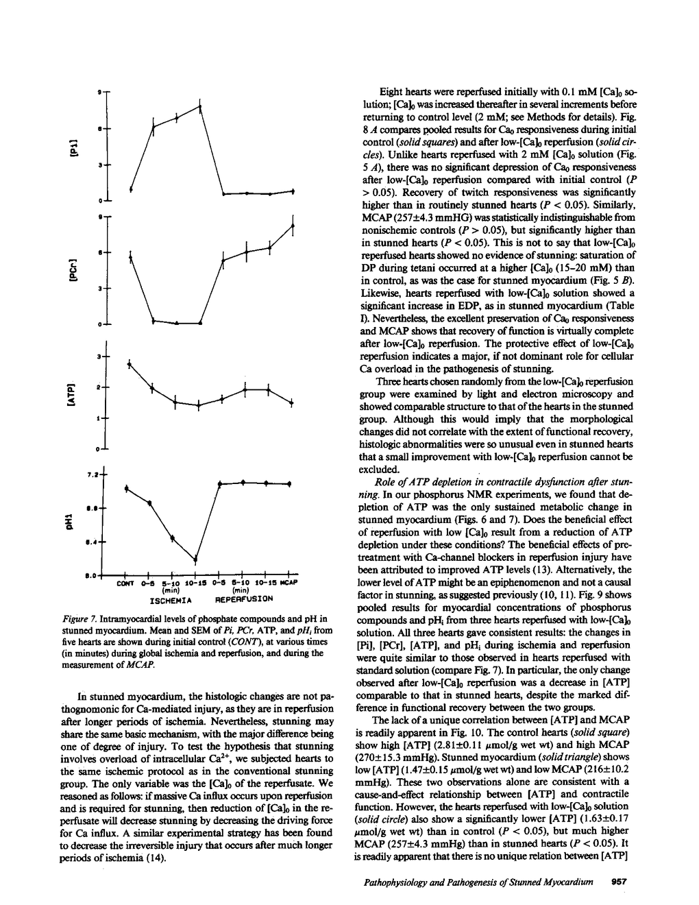 Contractile dysfunction in stunned myocardium could result from a decrease in the intracellular free [Ca2+] transient during each beat, a decrease in maximal Ca2+-activated force, or a shift in myofilament Ca2+ sensitivity. We measured developed pressure (DP) at several [Ca]0 (0.5-7.5 mM) in isovolumic Langendorff-perfused ferret hearts at 37 degrees C after 15 min of global ischemia (stunned group, n = 13) or in a nonischemic control group (n = 6). At all [Ca]0, DP was depressed in the stunned group (P less than 0.001). Maximal Ca2+-activated pressure (MCAP), measured from tetani after exposure to ryanodine, was decreased after stunning (P less than 0.05). Normalization of the DP-[Ca]0 relationship by corresponding MCAP (Ca0 sensitivity) revealed a shift to higher [Ca]0 in stunned hearts. To test whether cellular Ca overload initiates stunning, we reperfused with low-[Ca]0 solution (0.1-0.5 mM; n = 8). DP and MCAP in the low-[Ca]0 group were comparable to control (P greater than 0.05), and higher than in the stunned group (P less than 0.05). Myocardial [ATP] observed by phosphorus NMR failed to correlate with functional recovery. In conclusion, contractile dysfunction in stunned myocardium is due to a decline in maximal force, and a shift in Ca0 sensitivity (which may reflect either decreased myofilament Ca2+ sensitivity or a decrease in the [Ca2+] transient). Our results also indicate that calcium entry upon reperfusion plays a major role in the pathogenesis of myocardial stunning.