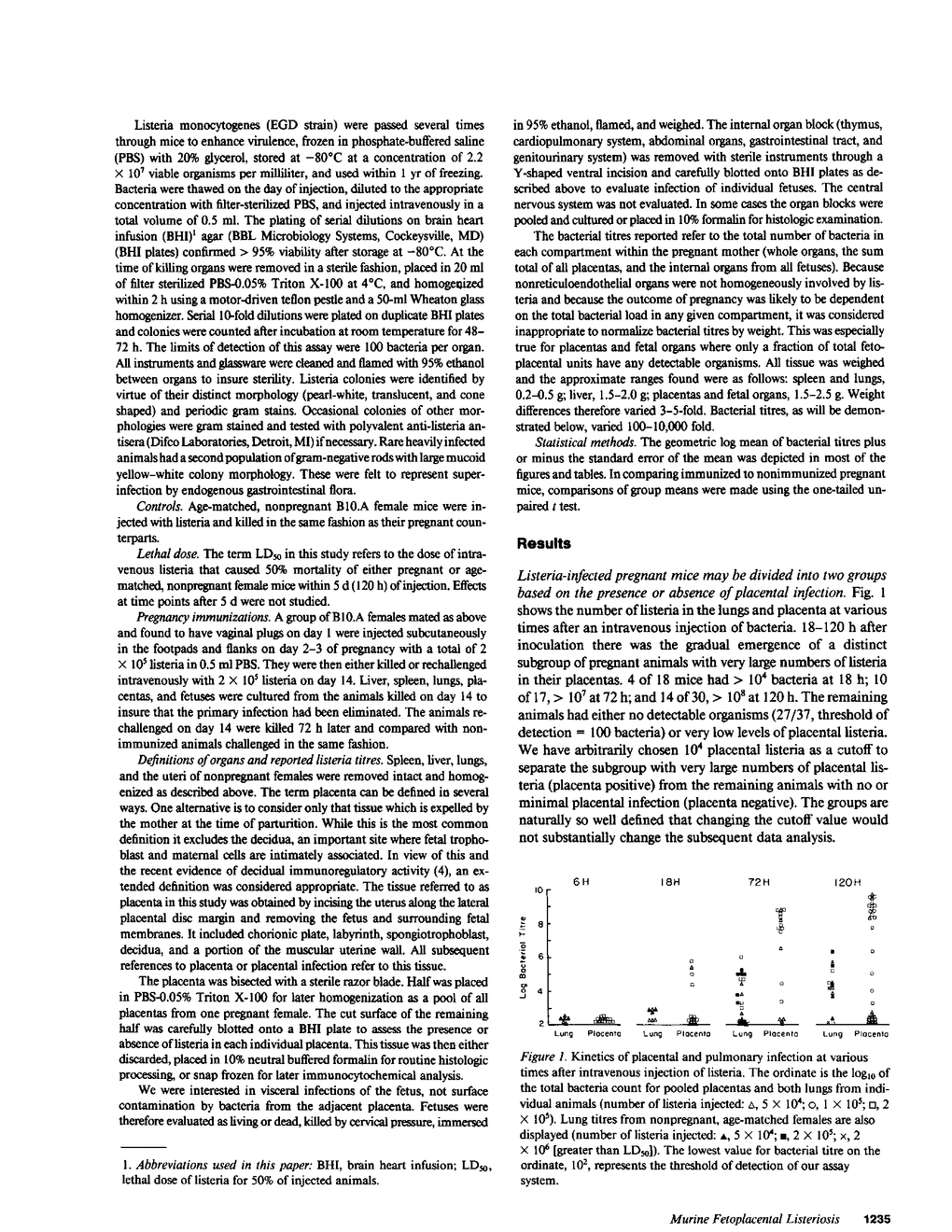 Recent evidence suggests that local immunoregulation may prevent rejection of the placenta by the mother. This local immunoregulation may also compromise the response to placental infection. Listeria monocytogenes infection in 121 pregnant mice and 1,050 fetoplacental units was examined and the kinetics of bacterial growth in various maternal and fetal tissues were determined. A subset of pregnant mice developed overwhelming placental listeria infections. Pregnancy did not impair the maternal immune response in the liver and spleen. Pregnant mice without placental infection had numbers of listeria equivalent to nonpregnant controls and mice immunized during pregnancy had significantly less listeria than nonimmunized controls. The secondary response in immunized pregnant mice had no effect on the development of placental infection and the histologic features of placental infection were distinct from those in other organs. Our data suggest that an ineffective local immune response may contribute to the pathogenicity of listeria for the placenta.