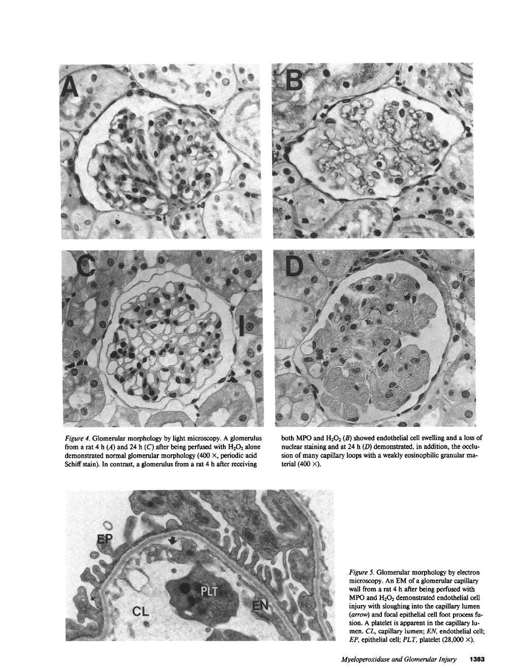 Reactive oxygen species, particularly hydrogen peroxide (H2O2), participate in neutrophil-mediated glomerulonephritis. However, the mechanism of H2O2 neptrotoxicity is unknown. Myeloperoxidase (MPO), a neutrophil cationic enzyme that localizes in glomeruli, can react with H2O2 and halides to form highly reactive products. We tested the hypothesis that the MPO-H2O2-halide system may induce glomerular injury by infusing MPO followed by H2O2 in a chloride-containing solution into the renal artery of rats. Controls received MPO or H2O2 alone. MPO-H2O2-perfused rats developed significant proteinuria, endothelial cell swelling, and epithelial cell foot process effacement, whereas control kidneys were normal. In the presence of free 125I, MPO-H2O2-perfused rats incorporated large amounts of 125I, localized to the glomerular basement membrane and mesangium by autoradiography, into glomeruli. Glomerular iodination was greatly decreased or absent in controls. The MPO-H2O2-halide system causes glomerular injury and may be important in neutrophil-mediated glomerulonephritis.