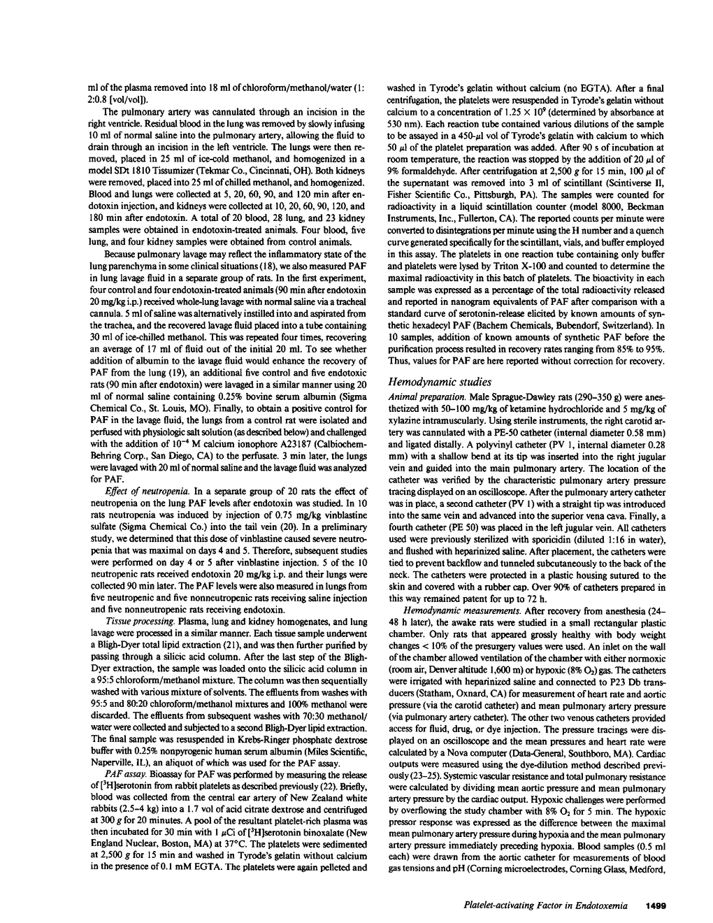 Within 20 min after intraperitoneal injection of Salmonella enteritidis endotoxin in rats, blood platelet-activating factor (PAF) increased from 4.3 +/- 1.3 to 13.7 +/- 2.0 ng/ml (P less than 0.01) and lung PAF from 32.3 +/- 4.9 to 312.3 +/- 19.6 ng (P less than 0.01), but not lung lavage PAF. We tested the effect of PAF receptor antagonists, CV 3988 and SRI 63-441, on endotoxin-induced hemodynamic changes and lung vascular injury. Pretreatment with CV 3988 attenuated systemic hypotension, preserved hypoxic pulmonary vasoconstriction, and prolonged survival of awake catheter-implanted endotoxin-treated (20 mg/kg) rats. Pretreatment with SRI 63-441 prevented the depressed hypoxic pulmonary vasoconstriction after low dose (2 mg/kg) endotoxin. Both CV 3988 and SRI 63-441 blocked the increased extravascular accumulation of 125I-albumin and water in perfused lungs isolated from endotoxin-treated rats. We conclude that PAF is produced in the lung during endotoxemia and may be an important mediator of the systemic and pulmonary hemodynamic changes as well as the acute lung vascular injury after endotoxemia.