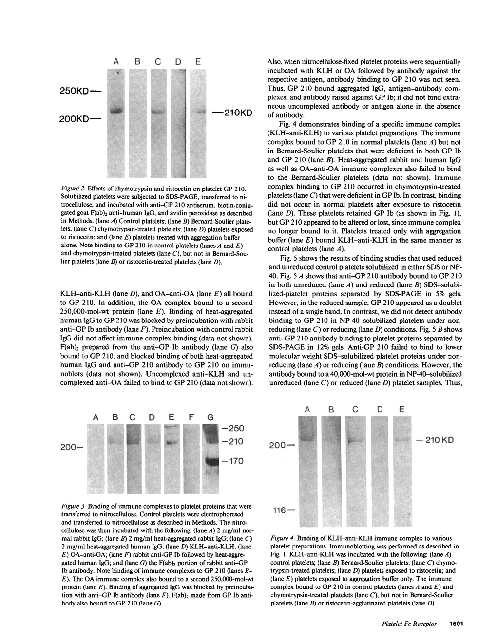 We previously identified a 210,000-mol-wt platelet glycoprotein (GP 210) that is missing from Bernard-Soulier platelets, and found that an antibody against GP 210 inhibits ristocetin-induced platelet agglutination. We now show by immunoblotting that GP 210 binds heat-aggregated rabbit and human IgG, as well as keyhole limpet hemocyanin (KLH)-anti-KLH and ovalbumin (OA)-anti-OA immune complexes. Immune complex binding to GP 210 was preserved on chymotrypsin-treated platelets that lacked glycoprotein Ib (GP Ib). In contrast, ristocetin-induced platelet agglutination resulted in disappearance of immunologically detectable GP 210 and loss of immune complex binding, even though GP Ib remained intact. Purified Fc fragments inhibited binding of anti-GP 210 antibody to intact platelets and to GP 210 on immunoblots. The Fc fragments also blocked immune complex binding to GP 210. Conversely, anti-GP 210 antiserum and F(ab)2 fragments inhibited binding of fluorescein-labeled Fc fragments to intact platelets. We conclude that GP 210 functions as a platelet Fc receptor.