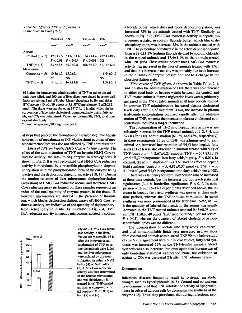 The hyperlipidemia accompanying infection has been attributed to production of tumor necrosis factor. This cytokine inhibits adipose tissue lipoprotein lipase, which could decrease clearance of lipoproteins. Infections also increase hepatic lipogenesis. We now have demonstrated that tumor necrosis factor-alpha stimulates lipid synthesis in vivo. 2 h after administration of tumor necrosis factor (25 micrograms/200 g), plasma triglycerides increase 2.2-fold and remain elevated for 17 h. Plasma cholesterol also increases, but this effect appears after 7 h. Tumor necrosis factor rapidly stimulates incorporation of tritiated water into fatty acids in the liver (1-2 h), which persists for 17 h. Also, tumor necrosis factor stimulates hepatic sterol synthesis. Of note, tumor necrosis factor treatment does not stimulate lipid synthesis in other tissues, including adipose tissue. Labeled fatty acids rapidly increase in the plasma, raising the possibility that stimulation of hepatic lipogenesis by tumor necrosis factor contributes to the hyperlipidemia of infection.