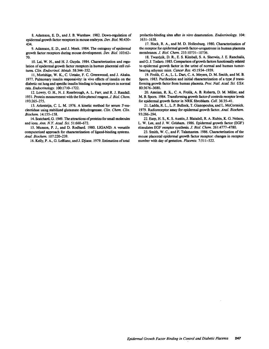 Placentas from streptozotocin-diabetic rats have previously been shown to be morphologically and biochemically immature when compared with those of control rats. The binding of epidermal growth factor (EGF) to plasma membranes prepared from placentas of control and streptozotocin-diabetic fetuses has been characterized on days 17 and 21 of gestation. Results from competitive binding data analyzed by Scatchard analysis indicate the presence of a single class of receptors on day 17 (KD = 5.4 X 10(-10)) and the appearance of a second class of binding sites for 125I-EGF by day 21 (Kd = 3.5 X 10(-9)) in membranes from control fetuses. Placental membranes from diabetic fetuses show decreased specific binding (approximately 30%) on both days and the absence of a second class of binding sites on day 21 of gestation. Results from a radioreceptor assay indicate that the quantity of EGF in the serum of fetuses removed from control rats on day 21 is twofold greater than the quantity in serum of fetuses from diabetic rats. These data reveal a developmental increase in EGF-binding sites in the placenta of normal, near-term fetal rats, largely because of the appearance of a second class of binding sites with a lower affinity for EGF. The failure (or delay) of this second class to develop in the diabetic may be important for the control of maturation and growth of this tissue.