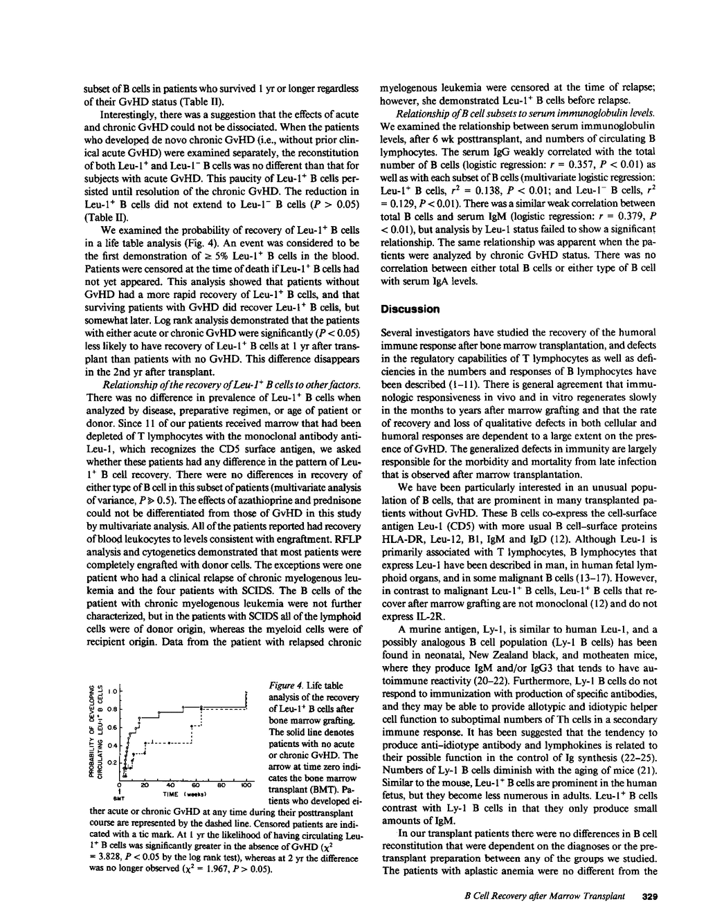 Differences in the expression of Leu-1 (CD5) define two populations of recovering B cells after human marrow transplantation, Leu-1+ and Leu-1- B cells. The Leu-1+ B cells were polyclonal, of donor origin, and did not express detectable interleukin 2 receptor. Leu-1+ B cells generally appeared 2-4 wk after marrow grafting and often preceded the recovery of Leu-1- B cells. Acute and chronic graft vs. host disease (GvHD) resulted in the recovery of significantly fewer Leu-1+ B cells, whereas Leu-1- B cells were only decreased in acute GvHD. Multivariate analysis showed no significant effect of age, disease, prednisone or azathioprine, or ex vivo treatment of the marrow with anti-Leu-1 and complement on recovery of Leu-1+ and Leu-1- B cells, independent of the effects of GvHD. Leu-1+ B cells are a major lymphocyte population posttransplant. They may reflect a stage of differentiation of normal B cells or a separate B cell lineage.