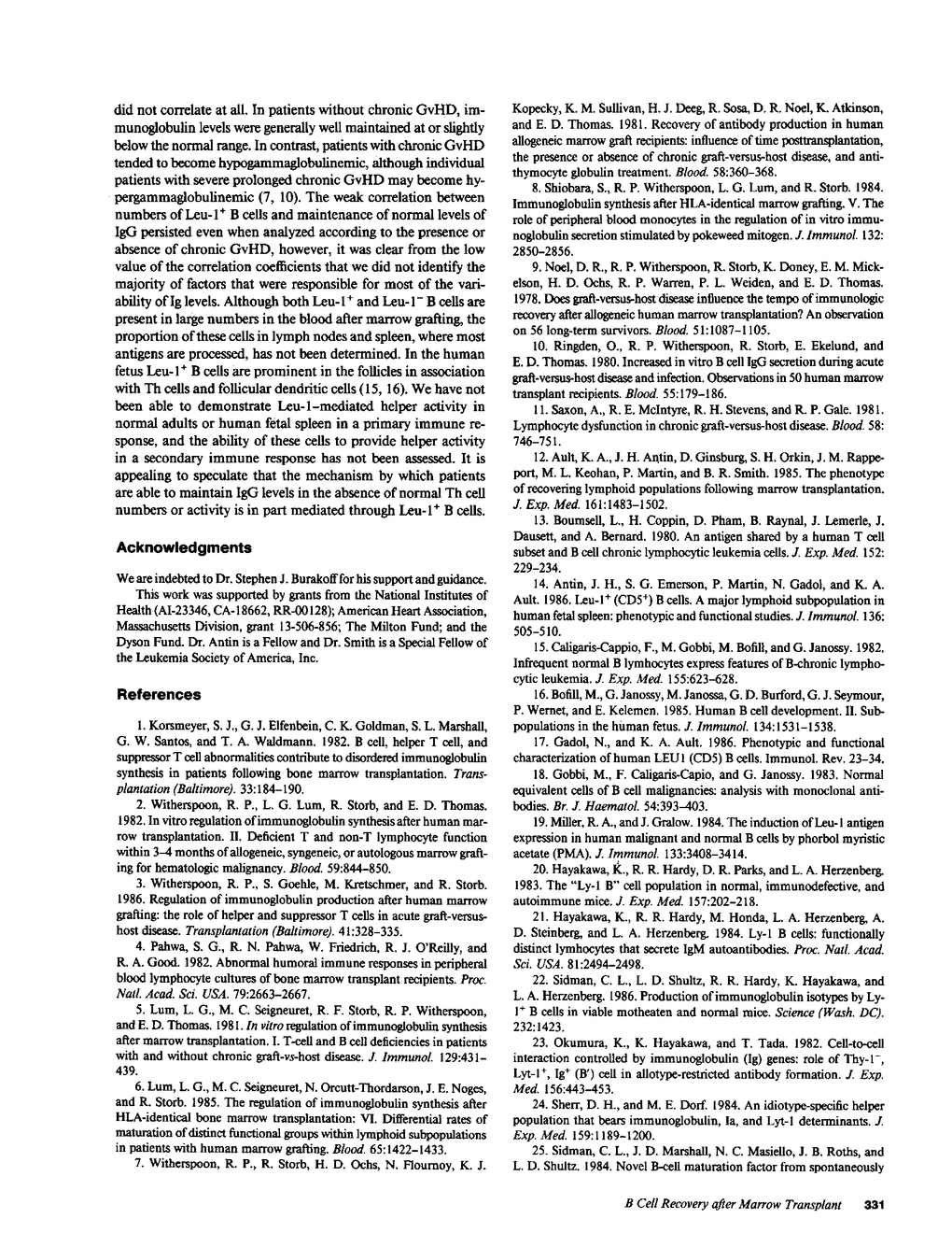 Differences in the expression of Leu-1 (CD5) define two populations of recovering B cells after human marrow transplantation, Leu-1+ and Leu-1- B cells. The Leu-1+ B cells were polyclonal, of donor origin, and did not express detectable interleukin 2 receptor. Leu-1+ B cells generally appeared 2-4 wk after marrow grafting and often preceded the recovery of Leu-1- B cells. Acute and chronic graft vs. host disease (GvHD) resulted in the recovery of significantly fewer Leu-1+ B cells, whereas Leu-1- B cells were only decreased in acute GvHD. Multivariate analysis showed no significant effect of age, disease, prednisone or azathioprine, or ex vivo treatment of the marrow with anti-Leu-1 and complement on recovery of Leu-1+ and Leu-1- B cells, independent of the effects of GvHD. Leu-1+ B cells are a major lymphocyte population posttransplant. They may reflect a stage of differentiation of normal B cells or a separate B cell lineage.