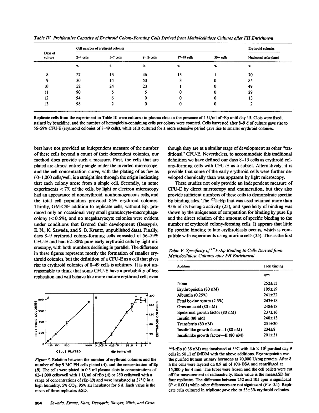 Morphological and biochemical studies of human colony-forming units-erythroid (CFU-E) have been hindered by their extreme rarity. Since burst-forming units-erythroid (BFU-E) develop into CFU-E, we used normal human blood BFU-E to generate large numbers of highly purified CFU-E in vitro. Using density centrifugation, sheep erythrocyte rosetting, surface immunoglobulin-positive cell depletion, adherence to plastic, and negative panning with monoclonal antibodies, human blood BFU-E were purified from 0.017 to 0.368%, a 22-fold purification with a 43% yield. The panned cells were cultured in methylcellulose with recombinant erythropoietin (rEp) and conditioned medium for 9 d. These cells were then collected and CFU-E were further purified using adherence and density centrifugation. This yielded almost 10(7) erythroid colony forming cells with a purity of 70 +/- 18%. Analysis of these cells by light and electron microscopy showed 94% erythroid cells. The prominent cell was a primitive blast with high nuclear/cytoplasmic ratio, dispersed nuclear chromatin and a distinct large nucleolus. The relation between the number of erythroid colonies and the number of day 9 cells plated in plasma clots was a straight line through the origin with a maximum number of erythroid colonies at 1 U/ml of rEp and no erythroid colonies without rEp. Specific binding with 125I-rEp showed that 60% of the binding was inhibited by excess pure erythropoietin (Ep), but not by albumin, fetal calf serum, and a variety of growth factors or glycoproteins. By days 12-13 of cell culture, when the progenitor cells matured to late erythroblasts, specific binding markedly declined. In this study, human CFU-E have been isolated in sufficient purity to characterize the morphology of these rare cells and in sufficient numbers to measure specific binding of Ep.