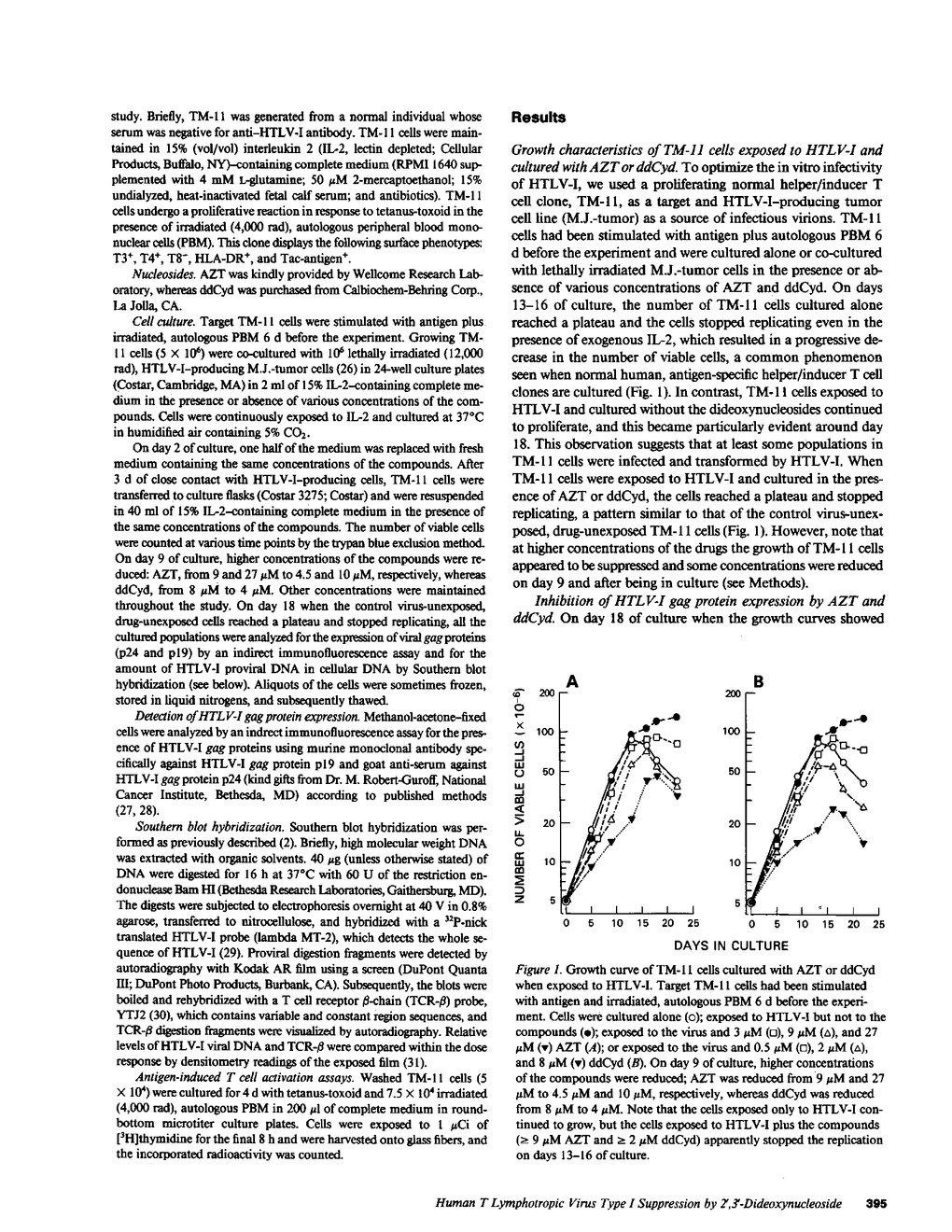 Human T lymphotropic virus type I (HTLV-I) is an exogenous RNA tumor virus etiologically linked to adult T cell leukemia and related diseases. In this paper, we describe that two 2',3'-dideoxynucleoside analogues, erythro 3'-azido-2',3'-dideoxythymidine (also called azidothymidine) and 2',3'-dideoxycytidine can inhibit the infectivity of HTLV-I against helper/inducer T cells in vitro. Both 2',3'-dideoxynucleoside analogues inhibited the overgrowth of target T cells, which was a consequence of virally mediated transformation, when they were exposed to the virus and cultured with the compounds. A profound decrease in the expression of HTLV-I gag-proteins was also observed. Moreover, we observed that the amount of proviral DNA detected in cellular DNA from the target T cells was substantially reduced when the cells were protected by the compounds against the virus and that at certain concentrations of the compounds the synthesis of viral DNA was completely suppressed. These results may be of value in developing a new pharmacological strategy for preventing the replication and possibly blocking the transmission of HTLV-I and related retroviruses in human beings.