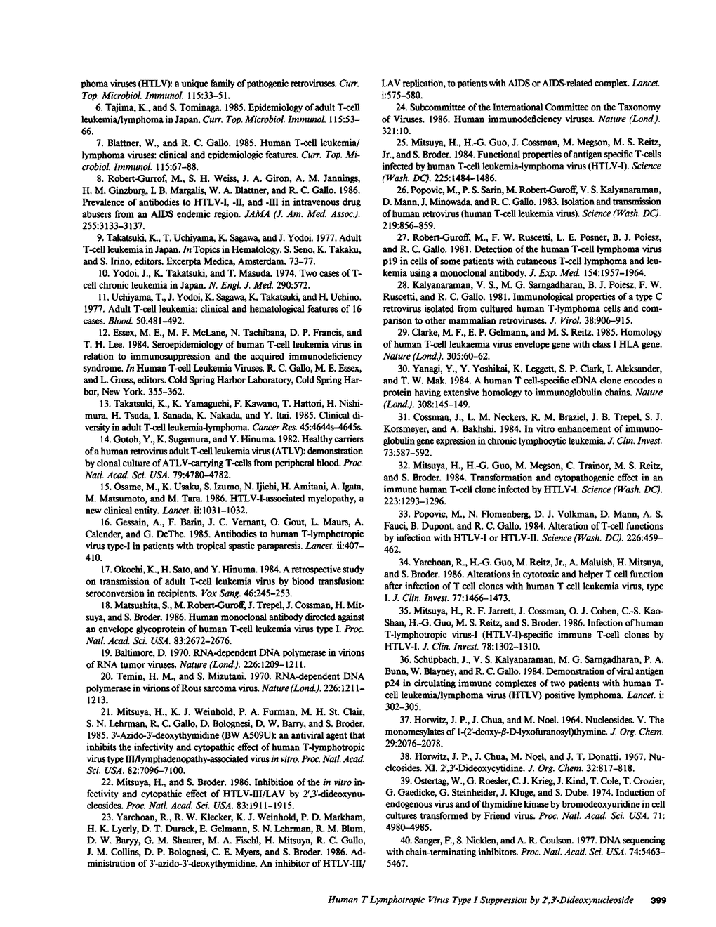 Human T lymphotropic virus type I (HTLV-I) is an exogenous RNA tumor virus etiologically linked to adult T cell leukemia and related diseases. In this paper, we describe that two 2',3'-dideoxynucleoside analogues, erythro 3'-azido-2',3'-dideoxythymidine (also called azidothymidine) and 2',3'-dideoxycytidine can inhibit the infectivity of HTLV-I against helper/inducer T cells in vitro. Both 2',3'-dideoxynucleoside analogues inhibited the overgrowth of target T cells, which was a consequence of virally mediated transformation, when they were exposed to the virus and cultured with the compounds. A profound decrease in the expression of HTLV-I gag-proteins was also observed. Moreover, we observed that the amount of proviral DNA detected in cellular DNA from the target T cells was substantially reduced when the cells were protected by the compounds against the virus and that at certain concentrations of the compounds the synthesis of viral DNA was completely suppressed. These results may be of value in developing a new pharmacological strategy for preventing the replication and possibly blocking the transmission of HTLV-I and related retroviruses in human beings.