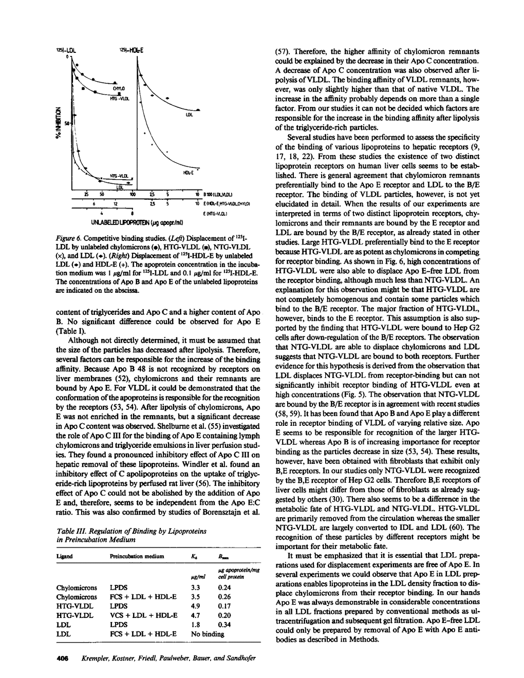 Binding of various 125I-lipoproteins to hepatic receptors was studied on cultured human hepatoma cells (Hep G2). Chylomicrons, isolated from a chylothorax, chylomicron remnants, hypertriglyceridemic very low-density lipoproteins, normotriglyceridemic very low-density lipoproteins (NTG-VLDL), their remnants, low-density lipoproteins (LDL), and HDL-E (an Apo E-rich high-density lipoprotein isolated from the plasma of a patient with primary biliary cirrhosis) were bound by high-affinity receptors. Chylomicron remnants and HDL-E were bound with the highest affinity. The results, obtained from competitive binding experiments, are consistent with the existence of two distinct receptors on Hep G2 cells: (a) a remnant receptor capable of high-affinity binding of triglyceride-rich lipoproteins and HDL-E, but not of Apo E free LDL, and (b) a LDL receptor capable of high-affinity binding of LDL, NTG-VLDL, and HDL-E. Specific binding of Apo E-free LDL was completely abolished in the presence of 3 mM EDTA, indicating that binding to the LDL receptor is calcium dependent. Specific binding of chylomicron remnants was not inhibited by the presence of even 10 mM EDTA. Preincubation of the Hep G2 cells in lipoprotein-containing medium resulted in complete suppression of LDL receptors but did not affect the remnant receptors. Hep G2 cells seem to be a suitable model for the study of hepatic receptors for lipoprotein in man.