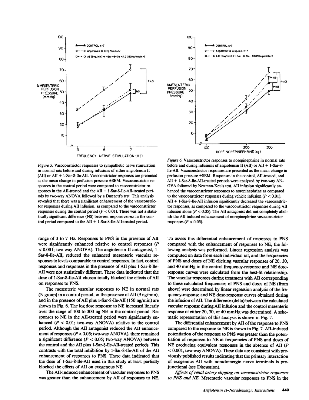 This study tested the hypothesis that interactions of endogenous angiotensin II (AII) with the noradrenergic neuroeffector junction are important in renin-dependent hypertension. In the in situ blood-perfused rat mesentery, in normal rats exogenous AII potentiated mesenteric vascular responses to periarterial (sympathetic) nerve stimulation (PNS) more than vascular responses to exogenous norepinephrine (NE). In 2-kidney-1-clip (2K-1C) rats with renovascular hypertension mesenteric vascular responses to PNS and NE were greater than in sham-operated rats, and renovascular hypertension mimicked the effects of exogenous AII with respect to enhancing responses to PNS more than responses to NE. In 2K-1C rats, but not in sham-operated rats, 1-Sar-8-Ile-AII markedly suppressed vascular responses to PNS, without influencing responses to NE. Finally, 1-Sar-8-Ile-AII attenuated sympathetic nerve stimulation-induced neuronal spillover of NE in 2K-1C rats, but not in sham-operated rats. These data indicate that renovascular hypertension enhances noradrenergic neurotransmission, and that this enhancement is mediated in part by AII-induced facilitation of NE release.