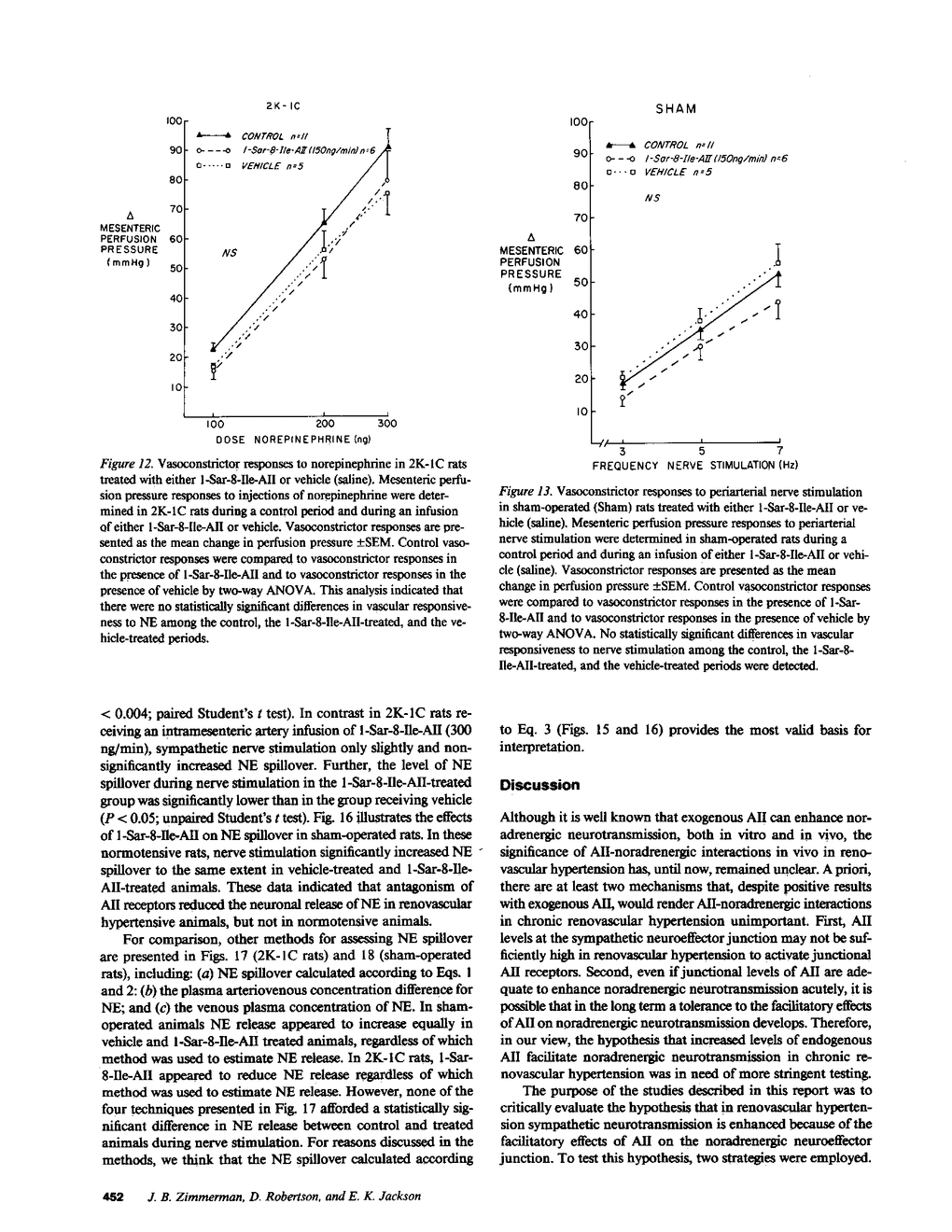 This study tested the hypothesis that interactions of endogenous angiotensin II (AII) with the noradrenergic neuroeffector junction are important in renin-dependent hypertension. In the in situ blood-perfused rat mesentery, in normal rats exogenous AII potentiated mesenteric vascular responses to periarterial (sympathetic) nerve stimulation (PNS) more than vascular responses to exogenous norepinephrine (NE). In 2-kidney-1-clip (2K-1C) rats with renovascular hypertension mesenteric vascular responses to PNS and NE were greater than in sham-operated rats, and renovascular hypertension mimicked the effects of exogenous AII with respect to enhancing responses to PNS more than responses to NE. In 2K-1C rats, but not in sham-operated rats, 1-Sar-8-Ile-AII markedly suppressed vascular responses to PNS, without influencing responses to NE. Finally, 1-Sar-8-Ile-AII attenuated sympathetic nerve stimulation-induced neuronal spillover of NE in 2K-1C rats, but not in sham-operated rats. These data indicate that renovascular hypertension enhances noradrenergic neurotransmission, and that this enhancement is mediated in part by AII-induced facilitation of NE release.