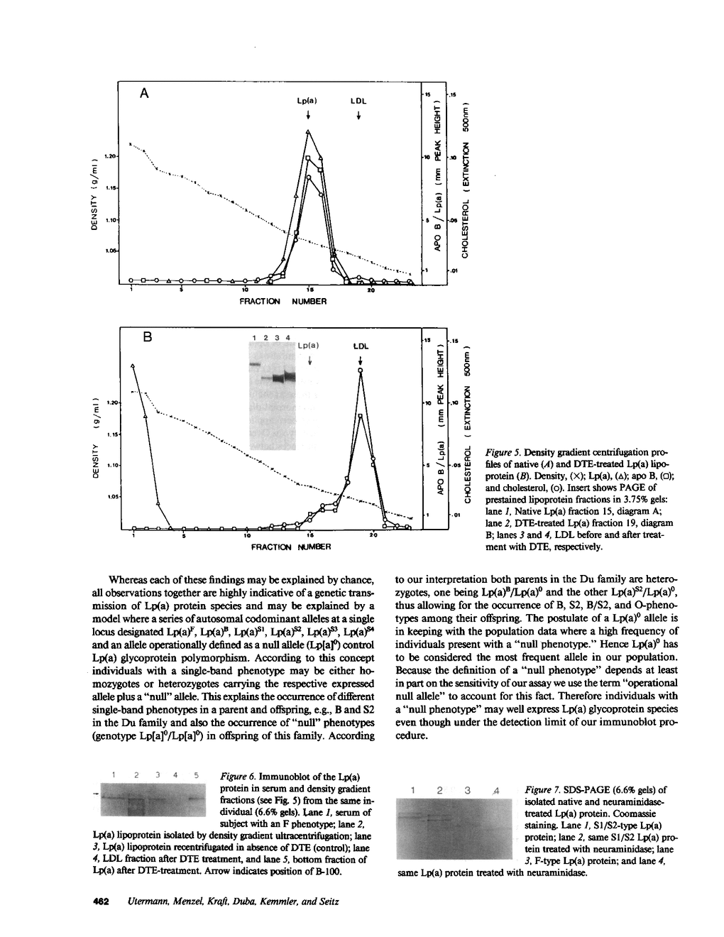The Lp(a) lipoprotein represents a quantitative genetic trait. It contains two different polypeptide chains, the Lp(a) glycoprotein and apo B-100. We have demonstrated the Lp(a) glycoprotein directly in human sera by sodium dodecyl sulfate-gel electrophoresis under reducing conditions after immunoblotting using anti-Lp(a) serum and have observed inter- and intraindividual size heterogeneity of the glycoprotein with apparent molecular weights ranging from approximately 400,000-700,000 D. According to their relative mobilities compared with apo B-100 Lp(a) patterns were categorized into phenotypes F (faster than apo B-100), B (similar to apo B-100), S1, S2, S3, and S4 (all slower than apo B-100), and into the respective double-band phenotypes. Results from neuraminidase treatment of isolated Lp(a) glycoprotein indicate that the phenotypic differences do not reside in the sialic acid moiety of the glycoprotein. Family studies are compatible with the concept that Lp(a) glycoprotein phenotypes are controlled by a series of autosomal alleles (Lp[a]F, Lp[a]B, Lp[a]S1, Lp[a]S2, Lp[a]S3, Lp[a]S4, and Lp[a]0) at a single locus. Comparison of Lp(a) plasma concentrations in different phenotypes revealed a highly significant association of phenotype with concentration. Phenotypes B, S1, and S2 are associated with high and phenotypes S3 and S4 with low Lp(a) concentrations. This suggests that the same gene locus is involved in determining Lp(a) glycoprotein phenotypes and Lp(a) lipoprotein concentrations in plasma and is the first indication for structural differences underlying the quantitative genetic Lp(a)-trait.