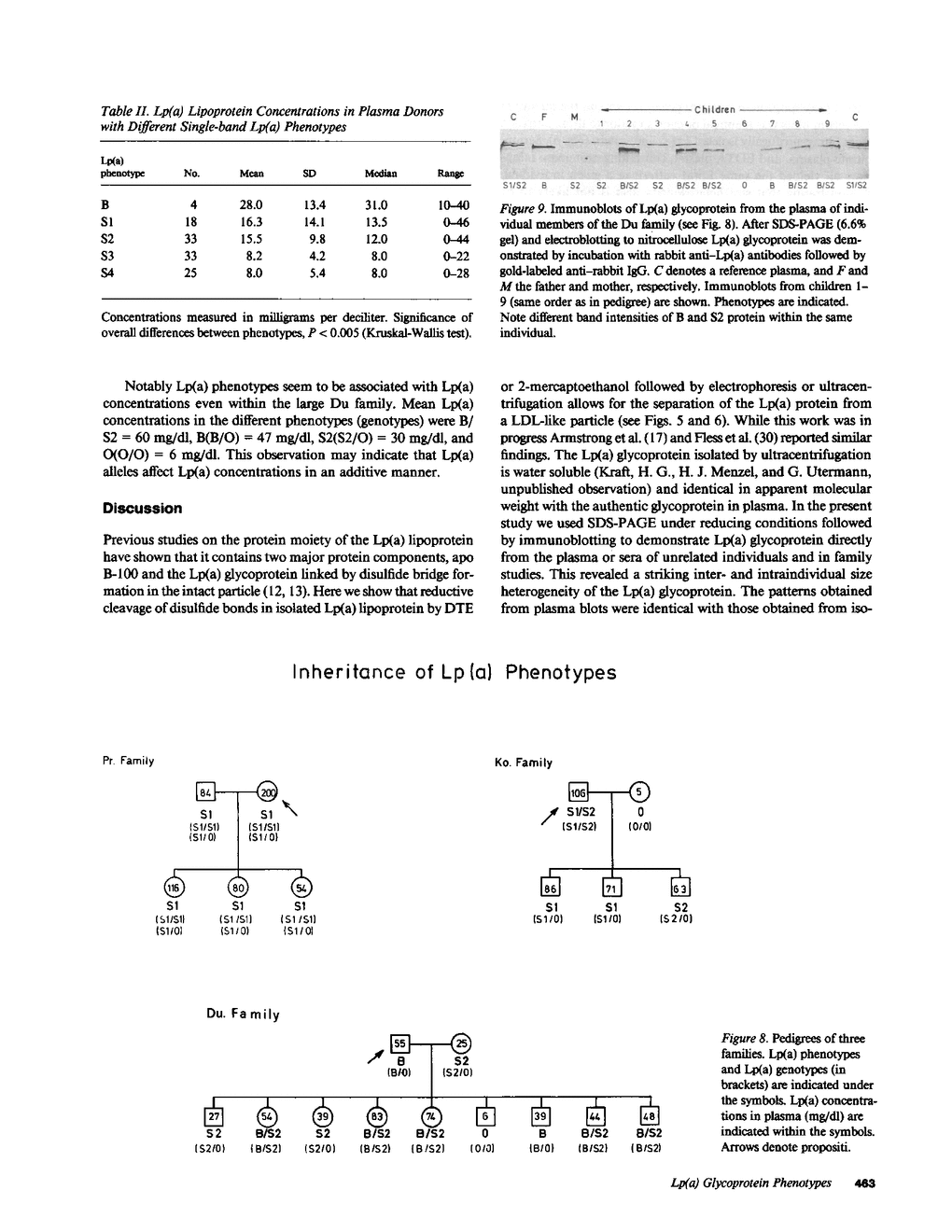 The Lp(a) lipoprotein represents a quantitative genetic trait. It contains two different polypeptide chains, the Lp(a) glycoprotein and apo B-100. We have demonstrated the Lp(a) glycoprotein directly in human sera by sodium dodecyl sulfate-gel electrophoresis under reducing conditions after immunoblotting using anti-Lp(a) serum and have observed inter- and intraindividual size heterogeneity of the glycoprotein with apparent molecular weights ranging from approximately 400,000-700,000 D. According to their relative mobilities compared with apo B-100 Lp(a) patterns were categorized into phenotypes F (faster than apo B-100), B (similar to apo B-100), S1, S2, S3, and S4 (all slower than apo B-100), and into the respective double-band phenotypes. Results from neuraminidase treatment of isolated Lp(a) glycoprotein indicate that the phenotypic differences do not reside in the sialic acid moiety of the glycoprotein. Family studies are compatible with the concept that Lp(a) glycoprotein phenotypes are controlled by a series of autosomal alleles (Lp[a]F, Lp[a]B, Lp[a]S1, Lp[a]S2, Lp[a]S3, Lp[a]S4, and Lp[a]0) at a single locus. Comparison of Lp(a) plasma concentrations in different phenotypes revealed a highly significant association of phenotype with concentration. Phenotypes B, S1, and S2 are associated with high and phenotypes S3 and S4 with low Lp(a) concentrations. This suggests that the same gene locus is involved in determining Lp(a) glycoprotein phenotypes and Lp(a) lipoprotein concentrations in plasma and is the first indication for structural differences underlying the quantitative genetic Lp(a)-trait.