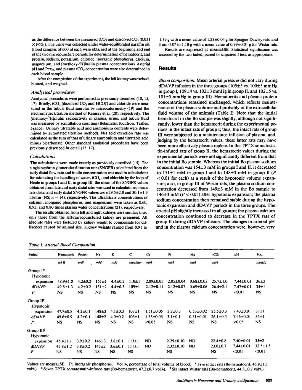 Paired micropuncture experiments were carried out in plasma-replete volume-expanded rats to examine the acute effects of 1-desamino-8-D-arginine vasopressin (dDAVP) on urinary acidification and tubular handling of bicarbonate and chloride. No effect was detected on the fractional absorption of water, total CO2, and chloride at end-proximal and early distal sites of superficial nephrons in intact animals; dDAVP, however, inhibited the fractional absorption of total CO2 in Henle's loop while stimulating that of chloride in thyroparathyroidectomized (TPTX) somatostatin-infused rats. In the distal tubule accessible to micropuncture, net total CO2 secretion was observed during hypotonic volume expansion, which reversed to net total CO2 absorption during dDAVP infusion in intact Wistar rats. Marked stimulation of urinary acidification occurred in all animals as attested by a fall in urine pH and bicarbonate excretion. Net acid excretion almost doubled in intact rats. We conclude that (a) antidiuretic hormone (ADH) inhibits fractional bicarbonate absorption in the thick ascending limb while stimulating that of chloride at least in TPTX somatostatin-infused rats, and (b) ADH stimulates proton secretion (or inhibits bicarbonate secretion) in the distal tubule and cortical collecting ducts, which leads to enhanced urinary acidification.