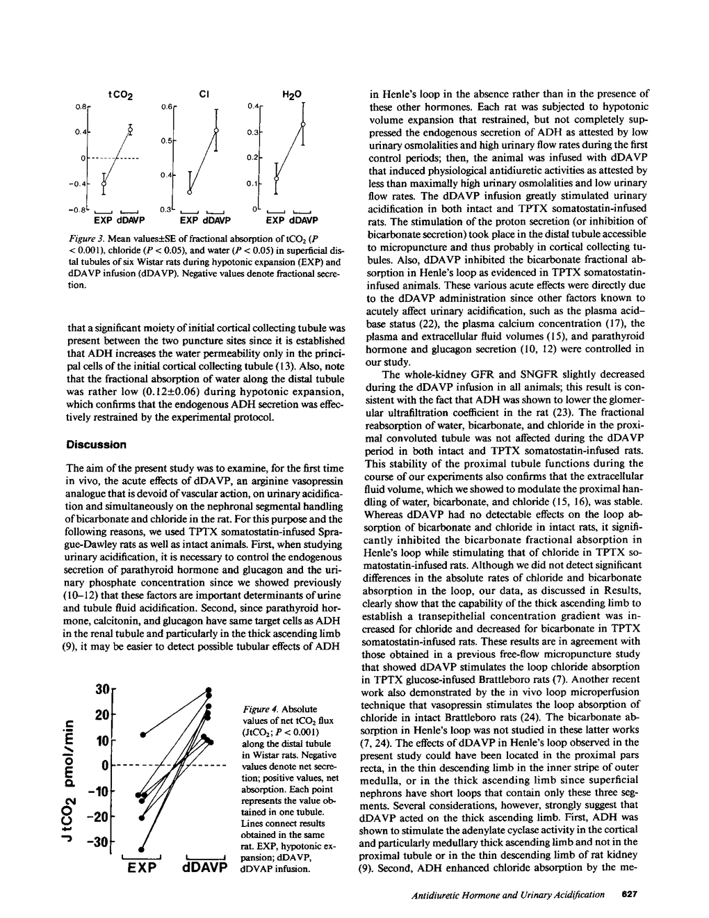 Paired micropuncture experiments were carried out in plasma-replete volume-expanded rats to examine the acute effects of 1-desamino-8-D-arginine vasopressin (dDAVP) on urinary acidification and tubular handling of bicarbonate and chloride. No effect was detected on the fractional absorption of water, total CO2, and chloride at end-proximal and early distal sites of superficial nephrons in intact animals; dDAVP, however, inhibited the fractional absorption of total CO2 in Henle's loop while stimulating that of chloride in thyroparathyroidectomized (TPTX) somatostatin-infused rats. In the distal tubule accessible to micropuncture, net total CO2 secretion was observed during hypotonic volume expansion, which reversed to net total CO2 absorption during dDAVP infusion in intact Wistar rats. Marked stimulation of urinary acidification occurred in all animals as attested by a fall in urine pH and bicarbonate excretion. Net acid excretion almost doubled in intact rats. We conclude that (a) antidiuretic hormone (ADH) inhibits fractional bicarbonate absorption in the thick ascending limb while stimulating that of chloride at least in TPTX somatostatin-infused rats, and (b) ADH stimulates proton secretion (or inhibits bicarbonate secretion) in the distal tubule and cortical collecting ducts, which leads to enhanced urinary acidification.