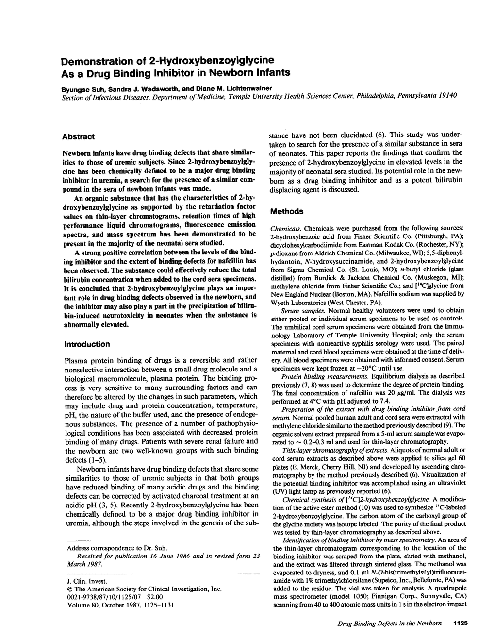 Newborn infants have drug binding defects that share similarities to those of uremic subjects. Since 2-hydroxybenzoylglycine has been chemically defined to be a major drug binding inhibitor in uremia, a search for the presence of a similar compound in the sera of newborn infants was made. An organic substance that has the characteristics of 2-hydroxybenzoylglycine as supported by the retardation factor values on thin-layer chromatograms, retention times of high performance liquid chromatograms, fluorescence emission spectra, and mass spectrum has been demonstrated to be present in the majority of the neonatal sera studied. A strong positive correlation between the levels of the binding inhibitor and the extent of binding defects for nafcillin has been observed. The substance could effectively reduce the total bilirubin concentration when added to the cord sera specimens. It is concluded that 2-hydroxybenzoylglycine plays an important role in drug binding defects observed in the newborn, and the inhibitor may also play a part in the precipitation of bilirubin-induced neurotoxicity in neonates when the substance is abnormally elevated.