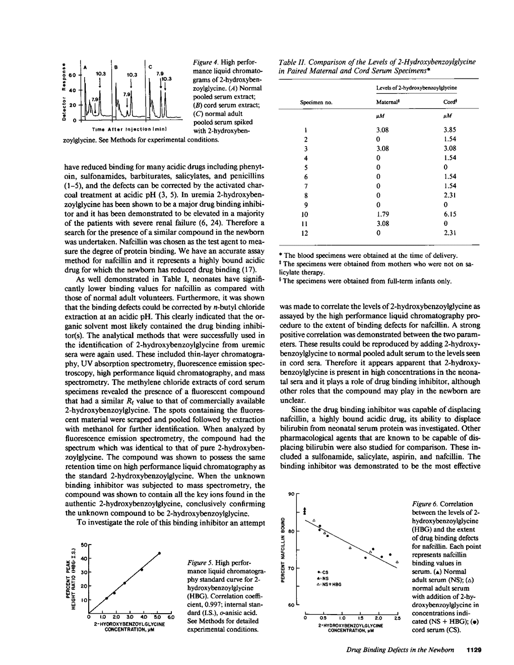 Newborn infants have drug binding defects that share similarities to those of uremic subjects. Since 2-hydroxybenzoylglycine has been chemically defined to be a major drug binding inhibitor in uremia, a search for the presence of a similar compound in the sera of newborn infants was made. An organic substance that has the characteristics of 2-hydroxybenzoylglycine as supported by the retardation factor values on thin-layer chromatograms, retention times of high performance liquid chromatograms, fluorescence emission spectra, and mass spectrum has been demonstrated to be present in the majority of the neonatal sera studied. A strong positive correlation between the levels of the binding inhibitor and the extent of binding defects for nafcillin has been observed. The substance could effectively reduce the total bilirubin concentration when added to the cord sera specimens. It is concluded that 2-hydroxybenzoylglycine plays an important role in drug binding defects observed in the newborn, and the inhibitor may also play a part in the precipitation of bilirubin-induced neurotoxicity in neonates when the substance is abnormally elevated.