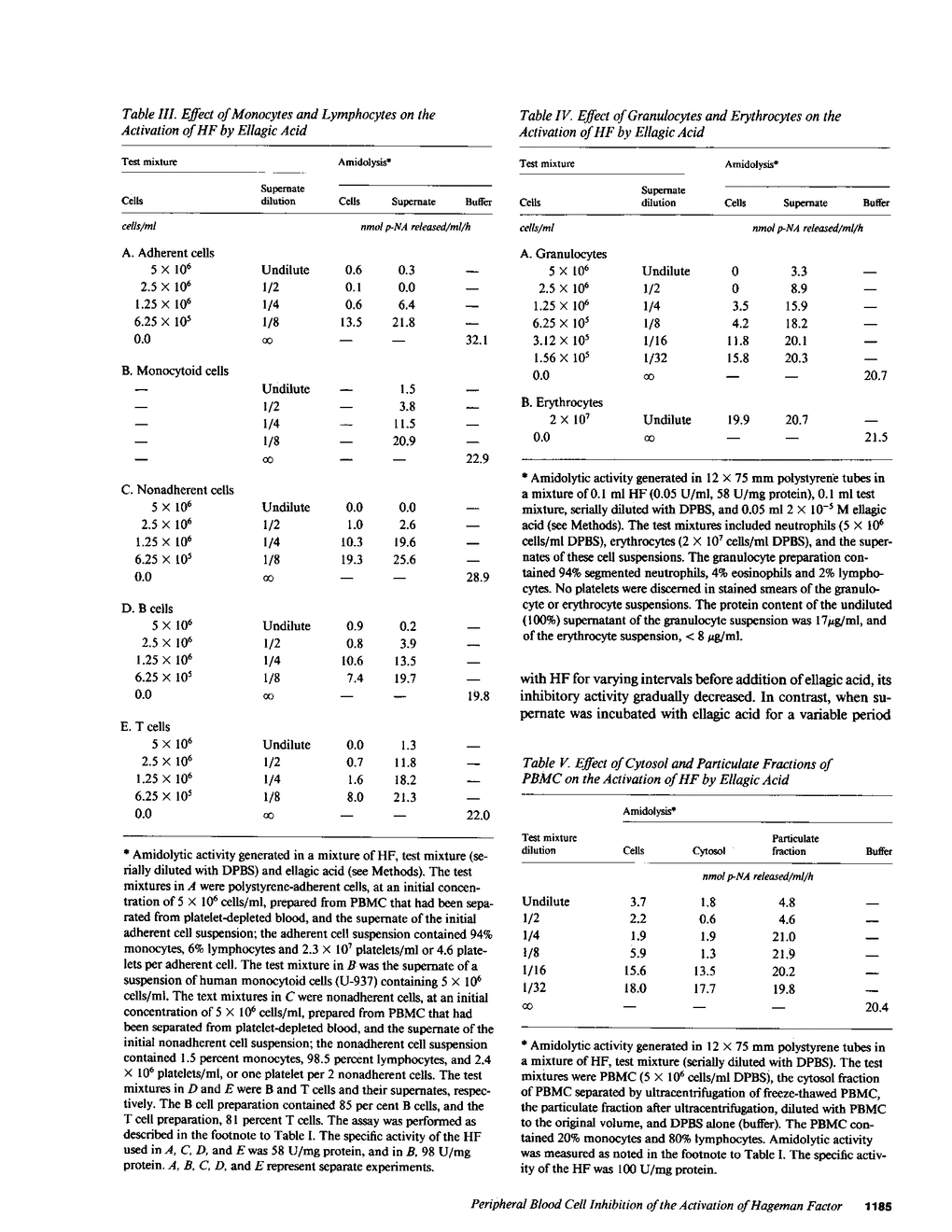 Suspensions of peripheral blood mononuclear cells (PBMC), monocytes, T or B lymphocytes, platelets or granulocytes, and cell-depleted supernatant fluids of these suspensions inhibited activation of Hageman factor (HF, Factor XII) by ellagic acid, a property not shared by erythrocytes. PBMC also inhibited HF activation by glass or sulfatides. Contaminating platelets may have contributed to inhibition by PBMC. Elaboration of agents inhibiting HF activation required metabolically active cells. The inhibitor(s) in PBMC supernates were not identified with known agents, but had properties of a nonenzymatic protein. PBMC supernates did not contain fibrinogen, nor alter the thrombin, prothrombin, or partial thromboplastin times of normal plasma, amidolysis by activated plasma thromboplastin antecedent (Factor XIa) or activated Stuart factor (Factor Xa) or esterolysis by C1 (C1 esterase); they inhibited plasmin minimally. These experiments suggest that peripheral blood cells may impede intravascular coagulation. Whether this property helps maintain the fluidity of blood is unclear.