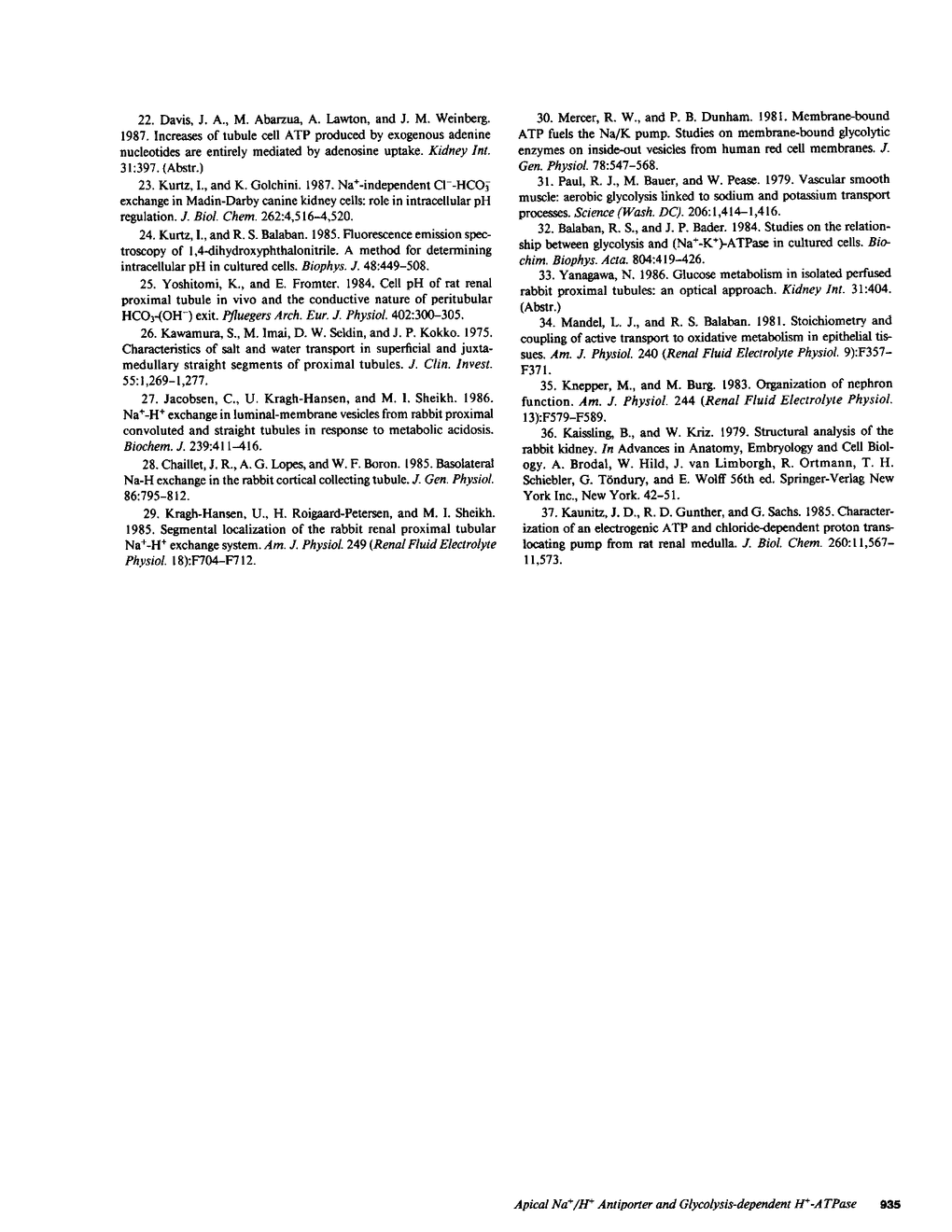The apical transport processes responsible for proton secretion were studied in the isolated perfused rabbit S3 proximal tubule. Intracellular pH (pHi) was measured with the pH dye, 2',7'-bis(carboxyethyl)-5,6-carboxyfluorescein. Steady state pHi in S3 tubules in nominally HCO3(-)-free solutions was 7.08 +/- 0.03. Removal of Na+ (lumen) caused a decrease in pHi of 0.34 +/- 0.06 pH/min. The decrease in pHi was inhibited 62% by 1 mM amiloride (lumen) and was unaffected by 50 microM 4,4'-diisothiocyanostilbene-2,2'-disulfonic acid (lumen) and Cl- removal (lumen, bath). After a brief exposure to 20 mM NH4Cl, pHi fell by approximately 0.7 and recovered at a rate of 0.89 +/- 0.15 pH/min in the nominal absence of Na+, HCO3-, organic anions, and SO4(2-) (lumen, bath). 1 mM N,N'-dicyclohexylcarbodiimide (lumen), 1 mM N-ethylmaleimide (lumen), 0.5 mM colchicine (bath), and 0.5 mM iodoacetic acid (lumen, bath) inhibited the Na+-independent pHi recovery rate by 73%, 55%, 77%, and 86%, respectively, whereas 1 mM KCN (lumen, bath) did not inhibit pHi recovery. Reduction of intracellular, but not extracellular chloride, also decreased the Na+-independent pHi recovery rate. In conclusion, the S3 proximal tubule has an apical Na+/H+ antiporter with a Michaelis constant for Na+ of 29 mM and a maximum velocity of 0.47 pH/min. S3 tubules also possess a plasma membrane H+-ATPase that can regulate pHi, has a requirement for intracellular chloride, and utilizes ATP derived primarily from glycolysis.