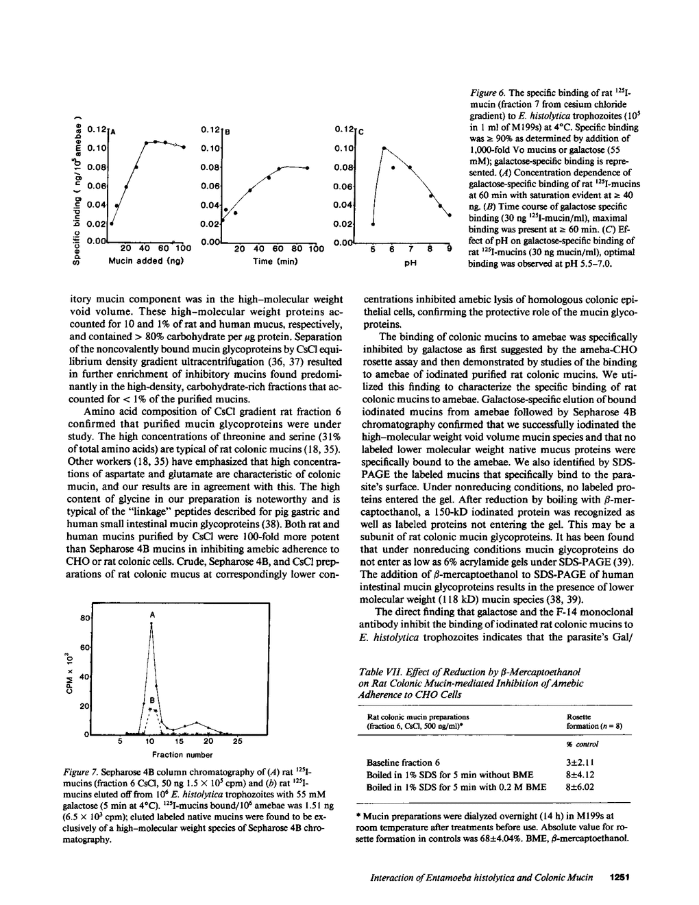 Establishment of adherence by Entamoeba histolytica is mediated by a 170-kD Gal/GalNAc inhibitable lectin and is required for cytolysis and phagocytosis of mammalian target cells. We studied the biochemical mechanisms of the in vitro interaction between rat and human colonic mucins and axenic E. histolytica trophozoites. Crude mucus prevented amebic adherence to Chinese hamster ovary (CHO) cells by up to 70%. Purification of the colonic mucins by Sepharose 4B chromatography, nuclease digestion, and cesium chloride gradient centrifugation resulted in a 1,000-fold enrichment of the inhibitory mucins. Purified rat mucin inhibited amebic adherence to and cytolysis of homologous rat colonic epithelial cells. Oxidation and enzymatic cleavage of rat mucin Gal and GalNAc residues completely abrogated mucin inhibition of amebic adherence. The binding of rat 125I-mucin to amebae was galactose specific, saturable, reversible, and pH dependent. A monoclonal antibody specific for the 170-kD amebic Gal/GalNAc lectin completely inhibited the binding of rat 125I-mucin. Rat mucin bound to Affigel affinity purified the amebic lectin from conditioned medium. Colonic mucin glycoproteins act as an important host defense by binding to the parasite's adherence lectin, thus preventing amebic attachment to and cytolysis of host epithelial cells.