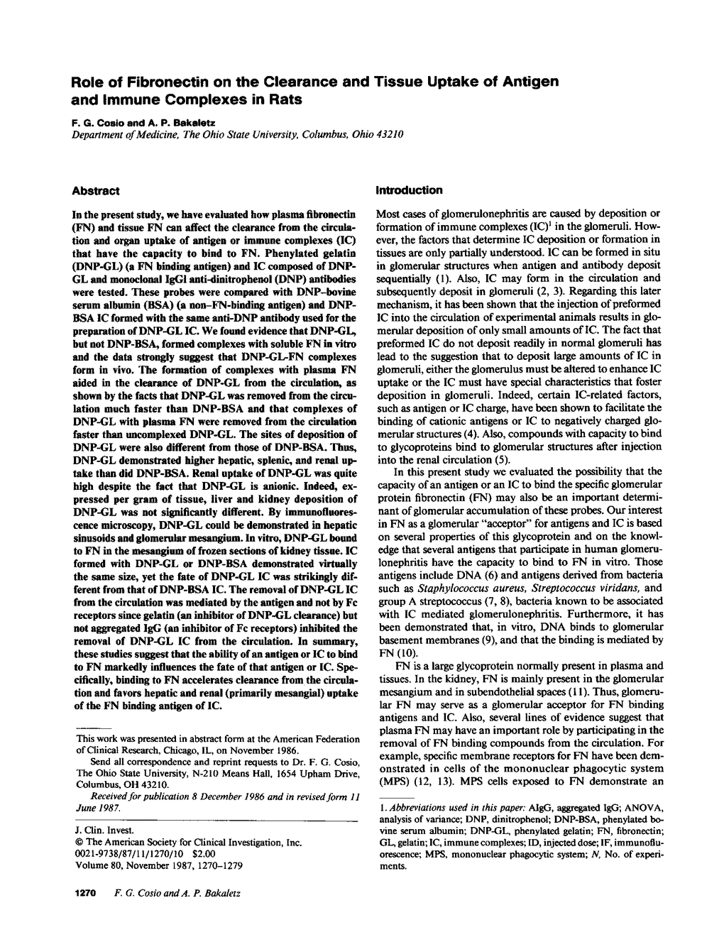 In the present study, we have evaluated how plasma fibronectin (FN) and tissue FN can affect the clearance from the circulation and organ uptake of antigen or immune complexes (IC) that have the capacity to bind to FN. Phenylated gelatin (DNP-GL) (a FN binding antigen) and IC composed of DNP-GL and monoclonal IgGl anti-dinitrophenol (DNP) antibodies were tested. These probes were compared with DNP-bovine serum albumin (BSA) (a non-FN-binding antigen) and DNP-BSA IC formed with the same anti-DNP antibody used for the preparation of DNP-GL IC. We found evidence that DNP-GL, but not DNP-BSA, formed complexes with soluble FN in vitro and the data strongly suggest that DNP-GL-FN complexes form in vivo. The formation of complexes with plasma FN aided in the clearance of DNP-GL from the circulation, as shown by the facts that DNP-GL was removed from the circulation much faster than DNP-BSA and that complexes of DNP-GL with plasma FN were removed from the circulation faster than uncomplexed DNP-GL. The sites of deposition of DNP-GL were also different from those of DNP-BSA. Thus, DNP-GL demonstrated higher hepatic, splenic, and renal uptake than did DNP-BSA. Renal uptake of DNP-GL was quite high despite the fact that DNP-GL is anionic. Indeed, expressed per gram of tissue, liver and kidney deposition of DNP-GL was not significantly different. By immunofluorescence microscopy, DNP-GL could be demonstrated in hepatic sinusoids and glomerular mesangium. In vitro, DNP-GL bound to FN in the mesangium of frozen sections of kidney tissue. IC formed with DNP-GL or DNP-BSA demonstrated virtually the same size, yet the fate of DNP-GL IC was strikingly different from that of DNP-BSA IC. The removal of DNP-GL IC from the circulation was mediated by the antigen and not by Fc receptors since gelatin (an inhibitor of DNP-GL clearance) but not aggregated IgG (an inhibitor of Fc receptors) inhibited the removal of DNP-GL IC from the circulation. In summary, these studies suggest that the ability of an antigen or IC to bind to FN markedly influences the fate of that antigen or IC. Specifically, binding to FN accelerates clearance from the circulation and favors hepatic and renal (primarily mesangial) uptake of the FN binding antigen of IC.