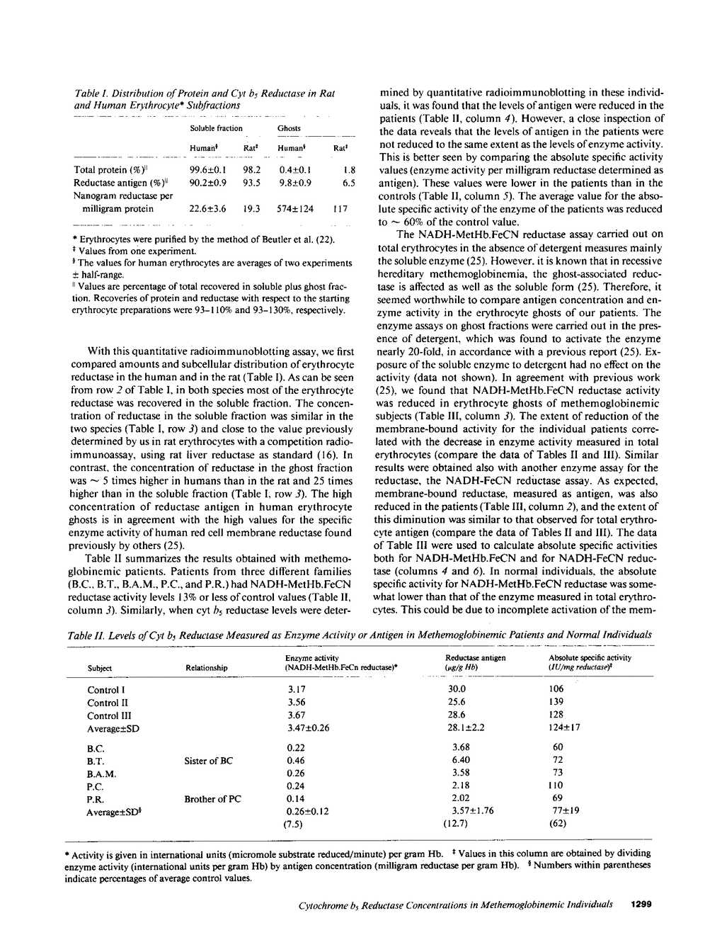 The activity of NADH-cytochrome b5 reductase (NADH-methemoglobin reductase) is generally reduced in red cells of patients with recessive hereditary methemoglobinemia. To determine whether this lower activity is due to reduced concentration of an enzyme with normal catalytic properties or to reduced activity of an enzyme present at normal concentration, we measured erythrocyte reductase concentrations with a quantitative radioimmunoblotting method, using affinity-purified polyclonal antibodies against rat liver microsomal reductase as probe. In five patients with the "mild" form of recessive hereditary methemoglobinemia, in which the activity of erythrocyte reductase was 4-13% of controls, concentrations of the enzyme, measured as antigen, were also reduced to 7-20% of the control values. The concentration of membrane-bound reductase antigen, measured in the ghost fraction, was similarly reduced. Thus, in these patients, the reductase deficit is caused mainly by a reduction in NADH-cytochrome b5 reductase concentration, although altered catalytic properties of the enzyme may also contribute to the reduced enzyme activity.