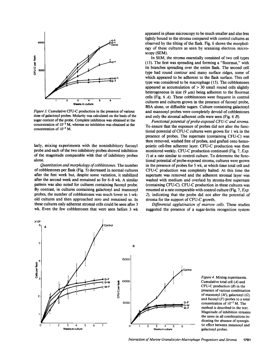 To study the molecular basis of "homing" of granulocyte-macrophage progenitors (CFU-C), we synthesized probes by covalent linking of sugars to bovine serum albumin. Long-term marrow cultures were established in the presence and absence of these probes. In the presence of galactosyl and mannosyl probes, total cell and CFU-C production in the supernate as well as the adherent layer were halted, and cobblestones (representing CFU-C bound to stroma) disappeared. Fucosyl probe and diffusible sugars had no effect on these parameters. These studies suggested membrane lectins with specificity for galactosyl and mannosyl residues may be responsible for the binding of CFU-C to supporting stroma. To determine if CFU-C possesses homing receptors with these specificities, we induced agglutination in marrow cell suspensions with these neoglycoprotein probes. Selective agglutination was observed only by galactosyl and mannosyl probes. The results suggest that CFU-C homing receptors are membrane lectins with specificity for galactosyl and mannosyl residues.