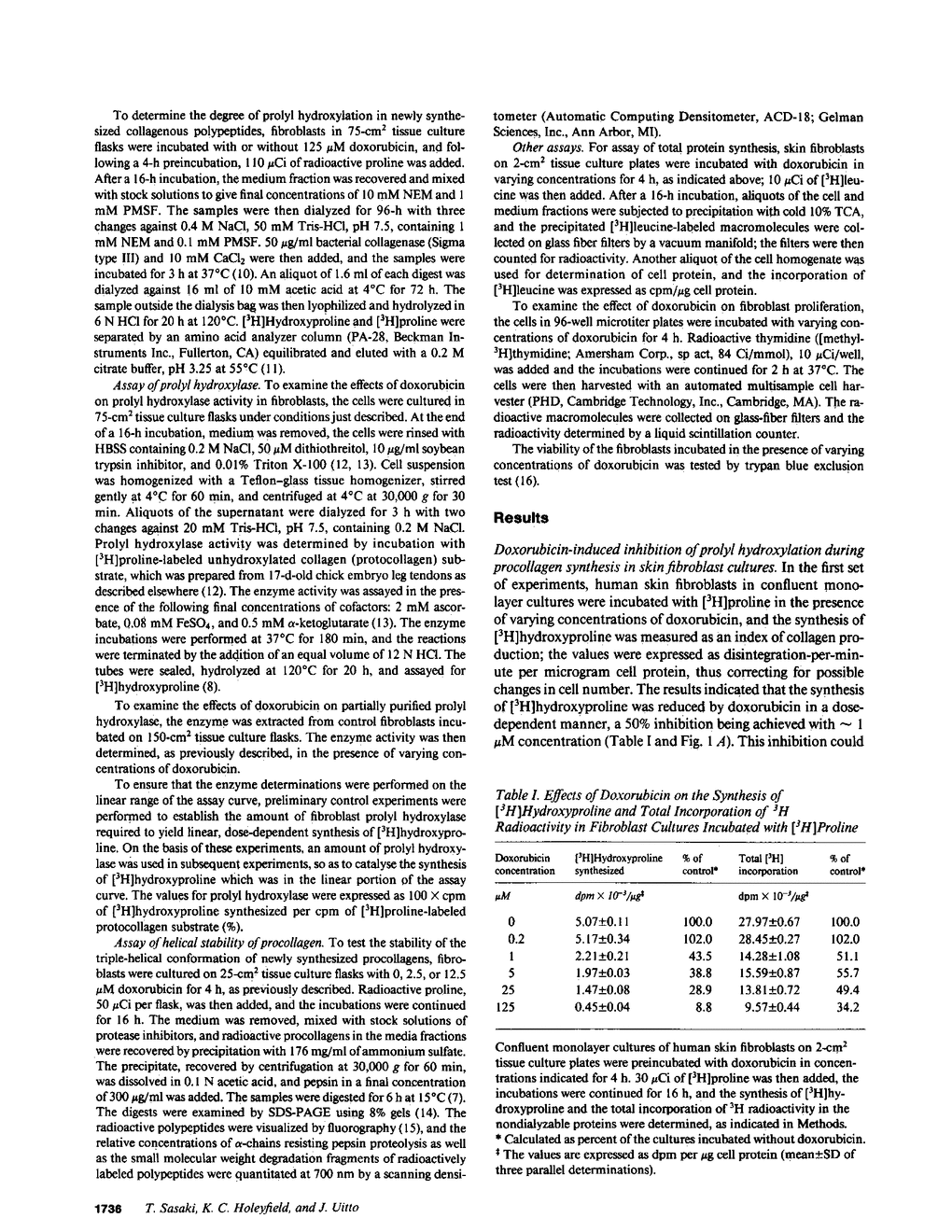 Previous clinical and experimental observations have indicated that wound healing is impaired as a result of treatment with doxorubicin, a chemotherapeutic agent. In this study, the effects of doxorubicin were examined in human skin fibroblast cultures with respect to collagen production and fibroblast proliferation. The results indicated that the synthesis of hydroxyproline as a marker of collagen production was markedly reduced, with an approximate concentration of inhibitor yielding 50% inhibition of 1 microM. This inhibition could be explained, in part, by generalized inhibition of total protein synthesis, but in addition, there was a significant inhibition of prolyl hydroxylation during collagen biosynthesis, as indicated by a reduction in the ratio of [3H]hydroxyproline/([3H]hydroxyproline + [3H]proline). The latter effect was shown to result from inhibition of prolyl hydroxylase by doxorubicin. As a consequence of reduced prolyl hydroxylation, the stability of newly synthesized procollagen triple helix was shown to be compromised. At the same time, doxorubicin significantly reduced fibroblast proliferation in vitro, as determined by [3H]thymidine incorporation. Thus, reduced collagen production and inhibition of fibroblast proliferation may explain the reduced wound healing in patients undergoing treatment with doxorubicin.