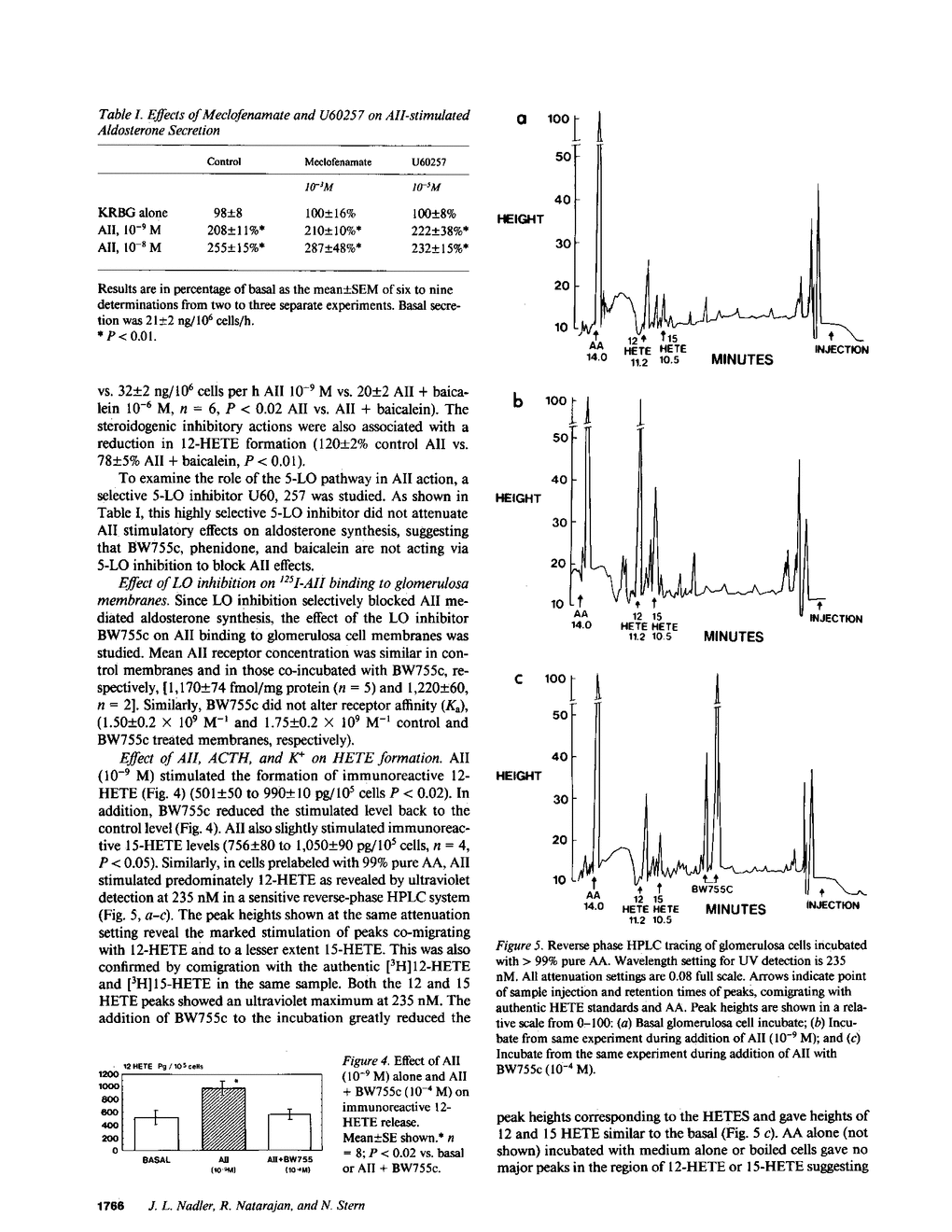 Angiotensin II (AII) in adrenal glomerulosa cells activates phospholipase C resulting in the formation of inositol phosphates and diacylglycerol rich in arachidonic acid (AA). Although glomerulosa cells can metabolize AA via cyclooxygenase (CO), this pathway plays little role in aldosterone synthesis. Recent evidence suggests that the lipoxygenase (LO) pathway may be important for hormonal secretion in endocrine tissues such as the islet of Langerhans. However, the capacity of the glomerulosa cell to synthesize LO products and their role in aldosterone secretion is not known. To study this, the effect of nonselective and selective LO inhibitors on AII, ACTH, and potassium-induced aldosterone secretion and LO product formation was evaluated in isolated rat glomerulosa cells. BW755c, a nonselective LO inhibitor dose dependently reduced the AII-stimulated level of aldosterone without altering AII binding (91 +/- 6 to 36 +/- 4 ng/10(6) cells/h 10(-4) M, P less than 0.001). The same effect was observed with another nonselective LO blocker, phenidone, and a more selective 12-LO inhibitor, Baicalein. In contrast U-60257, a selective 5-LO inhibitor did not change the AII-stimulated levels of aldosterone (208 +/- 11% control, AII 10(-9) M vs. 222 +/- 38%, AII + U-60257). The LO blockers action was specific for AII since neither BW755c nor phenidone altered ACTH or K+-induced aldosterone secretion. AII stimulated the formation of the 12-LO product 12-hydroxyeicosatetraenoic acid (12-HETE) as measured by ultraviolet detection and HPLC in AA loaded cells and by a specific RIA in unlabeled cells (501 +/- 50 to 990 +/- 10 pg/10(5) cells, P less than 0.02). BW755c prevented the AII-mediated rise in 12-HETE formation. In contrast, neither ACTH nor K+ increased 12-HETE levels. The addition of 12-HETE or its unstable precursor 12-HPETE (10(-9) or 10(-8) M) completely restored AII action during LO blockade. AII also produced an increase in 15-HETE formation, but the 15-LO products had no effect on aldosterone secretion. These studies suggest that the 12-LO pathway plays a key role as a new specific mediator of AII-induced aldosterone secretion.