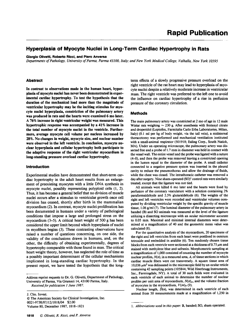 In contrast to observations made in the human heart, hyperplasia of myocyte nuclei has never been demonstrated in experimental cardiac hypertrophy. To test the hypothesis that the duration of the mechanical load more than the magnitude of ventricular hypertrophy may be the inciting stimulus for myocyte nuclei hyperplasia, constriction of the pulmonary artery was produced in rats and the hearts were examined 6 mo later. A 76% increase in right ventricular weight was measured. This hypertrophic response was accompanied by a 41% increase in the total number of myocyte nuclei in the ventricle. Furthermore, average myocyte cell volume per nucleus increased by 28%. No changes in weight, myocyte size, and nuclear number were observed in the left ventricle. In conclusion, myocyte nuclear hyperplasia and cellular hypertrophy both participate to the adaptive response of the right ventricular myocardium in long-standing pressure overload cardiac hypertrophy.