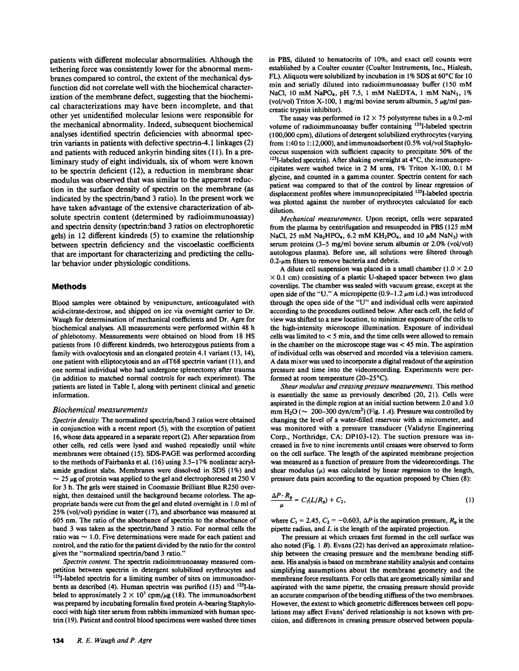 Hereditary spherocytosis is a common hemolytic anemia associated with deficiencies in spectrin, the principal structural protein of the erythrocyte membrane-skeleton. We have examined 20 different individuals from 10 spherocytosis kindreds and 2 elliptocytosis kindreds to determine the effects of different levels of spectrin deficiency on the viscoelastic properties of the erythrocyte membrane. Micropipettes were used to perform single-cell micromechanical measurements of approximately 1,000 individual cells to determine the membrane elastic shear modulus, the apparent membrane bending stiffness, and whole cell recovery time constant for the different cell populations. The membrane viscosity was calculated by the product of the shear modulus and the recovery time constant. Results show correlation between the fractional reduction in shear modulus and the fractional reduction in spectrin content (determined by spectrin radioimmunoassay) and spectrin density (determined by the ratios of spectrin to band 3 on electrophoresis gels) suggesting that membrane shear elasticity is directly proportional to the surface density of spectrin on the membrane (P less than 0.001). The apparent membrane bending stiffness is also reduced in proportion to the density of spectrin (P less than 0.001). The membrane viscosity is reduced relative to control (P less than 0.001), but the nature of the relationship between spectrin density and membrane viscosity is less clearly defined. These studies document striking relationships between partial deficiencies of erythrocyte spectrin and specific viscoelastic properties of the mutant membranes.