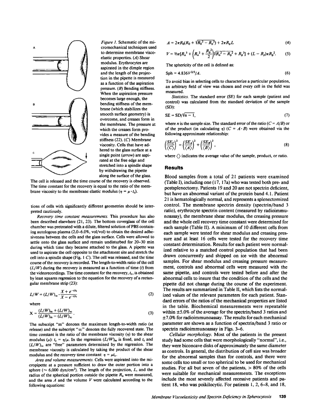 Hereditary spherocytosis is a common hemolytic anemia associated with deficiencies in spectrin, the principal structural protein of the erythrocyte membrane-skeleton. We have examined 20 different individuals from 10 spherocytosis kindreds and 2 elliptocytosis kindreds to determine the effects of different levels of spectrin deficiency on the viscoelastic properties of the erythrocyte membrane. Micropipettes were used to perform single-cell micromechanical measurements of approximately 1,000 individual cells to determine the membrane elastic shear modulus, the apparent membrane bending stiffness, and whole cell recovery time constant for the different cell populations. The membrane viscosity was calculated by the product of the shear modulus and the recovery time constant. Results show correlation between the fractional reduction in shear modulus and the fractional reduction in spectrin content (determined by spectrin radioimmunoassay) and spectrin density (determined by the ratios of spectrin to band 3 on electrophoresis gels) suggesting that membrane shear elasticity is directly proportional to the surface density of spectrin on the membrane (P less than 0.001). The apparent membrane bending stiffness is also reduced in proportion to the density of spectrin (P less than 0.001). The membrane viscosity is reduced relative to control (P less than 0.001), but the nature of the relationship between spectrin density and membrane viscosity is less clearly defined. These studies document striking relationships between partial deficiencies of erythrocyte spectrin and specific viscoelastic properties of the mutant membranes.