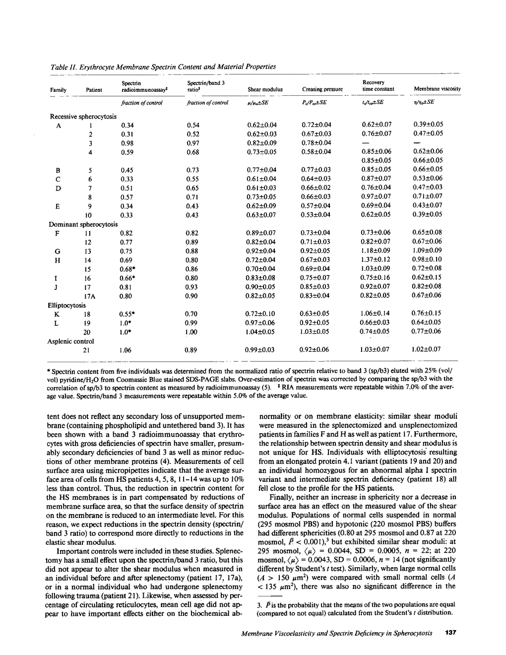 Hereditary spherocytosis is a common hemolytic anemia associated with deficiencies in spectrin, the principal structural protein of the erythrocyte membrane-skeleton. We have examined 20 different individuals from 10 spherocytosis kindreds and 2 elliptocytosis kindreds to determine the effects of different levels of spectrin deficiency on the viscoelastic properties of the erythrocyte membrane. Micropipettes were used to perform single-cell micromechanical measurements of approximately 1,000 individual cells to determine the membrane elastic shear modulus, the apparent membrane bending stiffness, and whole cell recovery time constant for the different cell populations. The membrane viscosity was calculated by the product of the shear modulus and the recovery time constant. Results show correlation between the fractional reduction in shear modulus and the fractional reduction in spectrin content (determined by spectrin radioimmunoassay) and spectrin density (determined by the ratios of spectrin to band 3 on electrophoresis gels) suggesting that membrane shear elasticity is directly proportional to the surface density of spectrin on the membrane (P less than 0.001). The apparent membrane bending stiffness is also reduced in proportion to the density of spectrin (P less than 0.001). The membrane viscosity is reduced relative to control (P less than 0.001), but the nature of the relationship between spectrin density and membrane viscosity is less clearly defined. These studies document striking relationships between partial deficiencies of erythrocyte spectrin and specific viscoelastic properties of the mutant membranes.