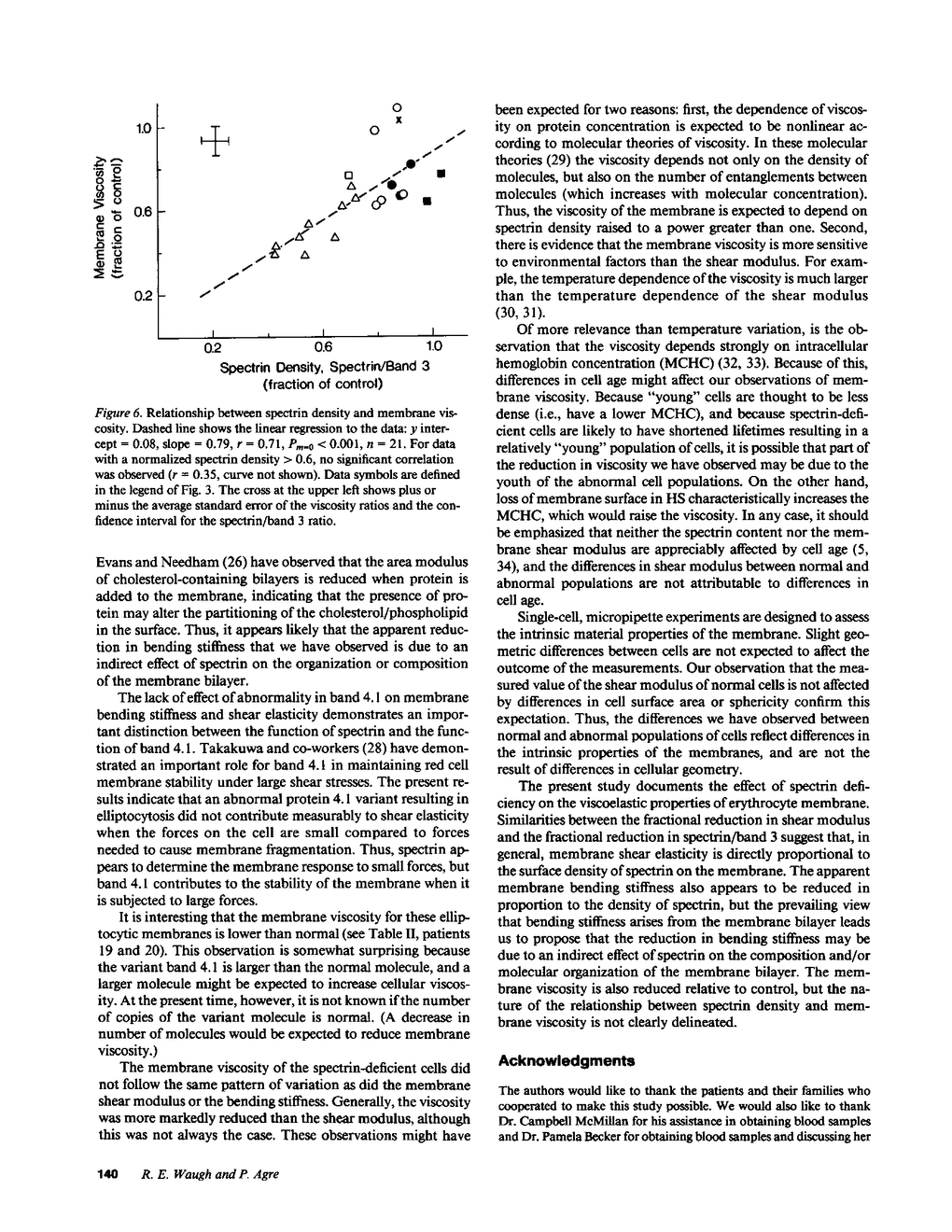 Hereditary spherocytosis is a common hemolytic anemia associated with deficiencies in spectrin, the principal structural protein of the erythrocyte membrane-skeleton. We have examined 20 different individuals from 10 spherocytosis kindreds and 2 elliptocytosis kindreds to determine the effects of different levels of spectrin deficiency on the viscoelastic properties of the erythrocyte membrane. Micropipettes were used to perform single-cell micromechanical measurements of approximately 1,000 individual cells to determine the membrane elastic shear modulus, the apparent membrane bending stiffness, and whole cell recovery time constant for the different cell populations. The membrane viscosity was calculated by the product of the shear modulus and the recovery time constant. Results show correlation between the fractional reduction in shear modulus and the fractional reduction in spectrin content (determined by spectrin radioimmunoassay) and spectrin density (determined by the ratios of spectrin to band 3 on electrophoresis gels) suggesting that membrane shear elasticity is directly proportional to the surface density of spectrin on the membrane (P less than 0.001). The apparent membrane bending stiffness is also reduced in proportion to the density of spectrin (P less than 0.001). The membrane viscosity is reduced relative to control (P less than 0.001), but the nature of the relationship between spectrin density and membrane viscosity is less clearly defined. These studies document striking relationships between partial deficiencies of erythrocyte spectrin and specific viscoelastic properties of the mutant membranes.