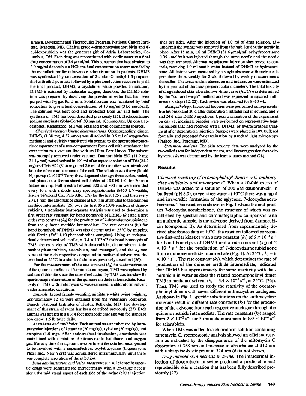 The reactivity of antitumor anthracycline and mitomycin C antibiotics with the oxomorpholinyl radical dimers, bi(3,5,5-trimethyl-2-oxomorpholin-3-yl) (TM3) and bi(3,5-dimethyl-5-hydroxymethyl-2-oxomorpholin-3-yl) (DHM3), was studied in vitro. The oxomorpholinyl radical reduced daunorubicin to a quinone methide intermediate that reacted with solvent to form 7-deoxydaunorubicinone. The solvolysis reaction followed first order kinetics, and the reactivity rate constants (k2) measured for seven anthracycline analogues ranged from 2 X 10(-2) s-1 to 8.0 X 10(-4) s-1. The chemical reactivity of each anthracycline quinone methide correlated with the total skin toxicity caused by the respective parent anthracycline following injection into swine skin. Microscopic examination of experimental lesions in swine skin resemble those observed in humans after inadvertant chemotherapy extravasation. Hydrocortisone sodium succinate was not effective for the treatment of doxorubicin-induced skin necrosis, whereas DHM3 was effective for the treatment of skin necrosis caused by all seven anthracyclines and by the quinone containing antibiotic, mitomycin C.