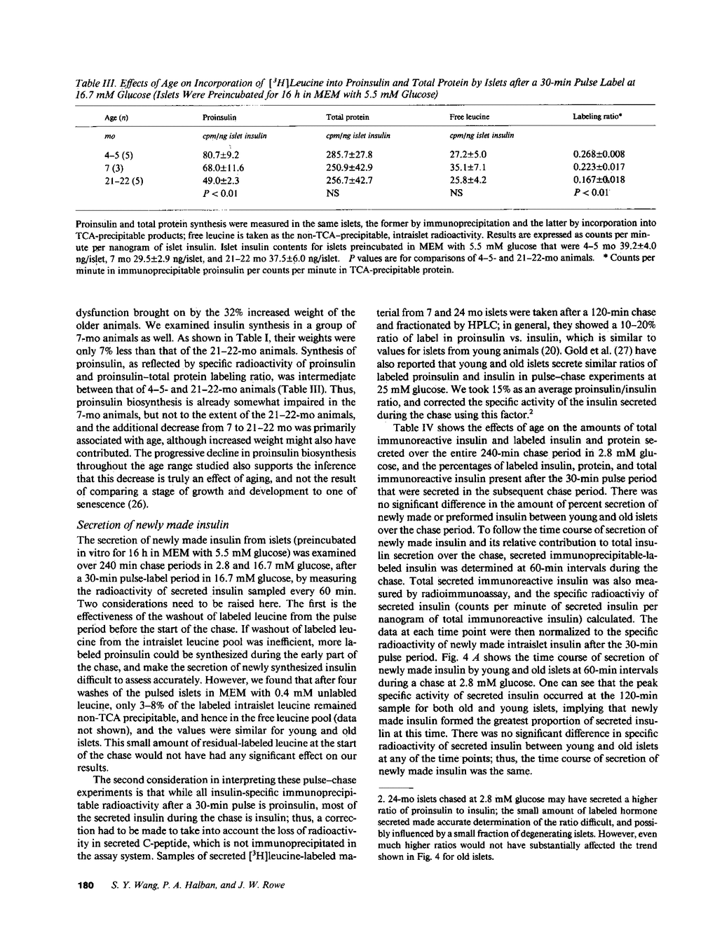 Aging in men and rodents is associated with a marked decline in glucose stimulated insulin secretion by pancreatic beta cells (B cells). Secreted insulin is the end result of a series of steps along the biosynthetic protein-secretion pathway, including insulin gene transcription, processing of transcripts to preproinsulin mRNA, translation of mRNA, segregation and processing of newly made proinsulin in secretory vesicles, proinsulin to insulin conversion, transport of vesicles to the plasma membrane, and exocytosis. We have examined the influence of age at three stages along this pathway: preproinsulin mRNA levels, proinsulin synthesis, and secretion of newly made and preformed insulin, using Fischer rats, a widely studied rodent model of aging. Pancreatic weights and total insulin contents, islet sizes, and mean insulin content per islet were the same in young adult (4-5 mo) and senescent (21-22 mo) animals. There was no effect of age on preproinsulin mRNA levels in whole pancreata of fed animals, or in isolated islets cultured for 16 h in 5.5 mM glucose. Proinsulin biosynthesis and the secretion of newly made insulin were compared in isolated islets preincubated in 5.5 mM glucose. After a pulse label at 16.7 mM glucose, proinsulin synthesis, assayed by immunoprecipitation, was decreased 16% in 7 mo islets and 39% in 21-22 mo islets, compared with 4-5 mo islets, though total protein synthesis was not reduced. When chased at 2.8 mM glucose, 4-5 month and 21-22 mo islets showed no difference in release of preformed or newly made insulin. When chased at 16.7 mM glucose, there was a significant decrease in the secretion of newly made insulin in the old islets compared with the young islets. There was preferential release of newly made insulin over preformed insulin in both young and old islets. However, since secretion of preformed insulin was decreased much more than secretion of newly made insulin in senescent islets, these displayed a two- to threefold increase in the proportion of newly made insulin relative to total immunoreactive insulin released compared with young adult islets. The differential effects of aging on these steps in the insulin synthesis-secretion pathway may be due to varying impairments in signals transducing the glucose stimulus into the wide range of B cell responses to glucose.