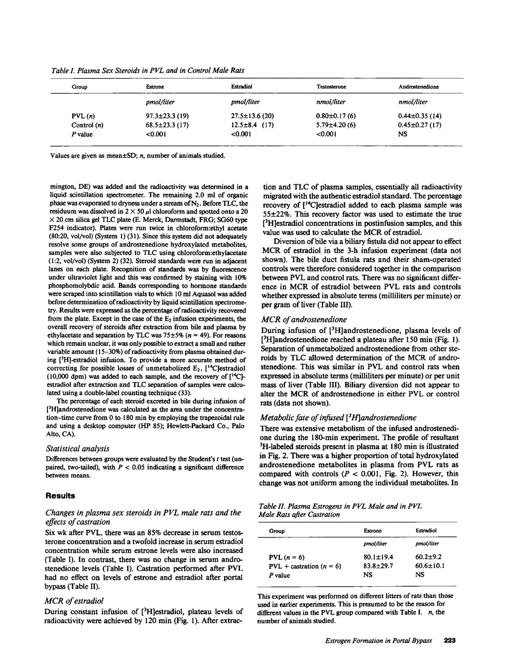 We sought to establish the mechanism for the raised serum estrogen levels that occur in male rats with portal hypertension and resultant portal bypass. Using the portal vein ligated (PVL) rat model, we evaluated plasma steroid hormone concentrations, metabolic clearance rate (MCR) of estradiol, and hepatic metabolism of androstenedione to estrogens and other products. In contrast to serum testosterone levels that were reduced, serum androstenedione levels were normal in the PVL rat. Estradiol MCR was measured by a constant intravenous infusion technique and was found to be similar in PVL and control animals. Androstenedione MCR was determined during constant intravenous infusion of [3H]androstenedione, and the resultant radiolabeled steroids present in plasma were separated by thin layer chromatography. The MCR of androstenedione was not diminished in PVL rats compared with controls. However, there was a sevenfold increase in the plasma estradiol derived from [3H]androstenedione in rats with portal bypass. Examination of radiolabel excreted in bile during infusion of [3H]androstenedione showed that 25-46% of this steroid was converted to estradiol in PVL rats compared with less than 3% in control male rats (P less than 0.001). Moreover, there was a selective reduction in the excretion of 16 alpha-hydroxyandrostenedione, a finding which suggested that the metabolism of androstenedione via this pathway was decreased. Androstenedione 16 alpha-hydroxylation is known to be catalyzed by a male-specific cytochrome P-450 isoform, P-450UT-A. We conclude that raised plasma estradiol levels after portal bypass in male rats are due to increased production rates, resulting in turn from enhanced aromatization of androstenedione to estradiol. On the basis of the observed specific changes in androstenedione hydroxylation pathways, it is proposed that alterations in levels of sex-specific forms of cytochrome P-450 occur in male rats with portal bypass and could account for the enhanced formation of estradiol.