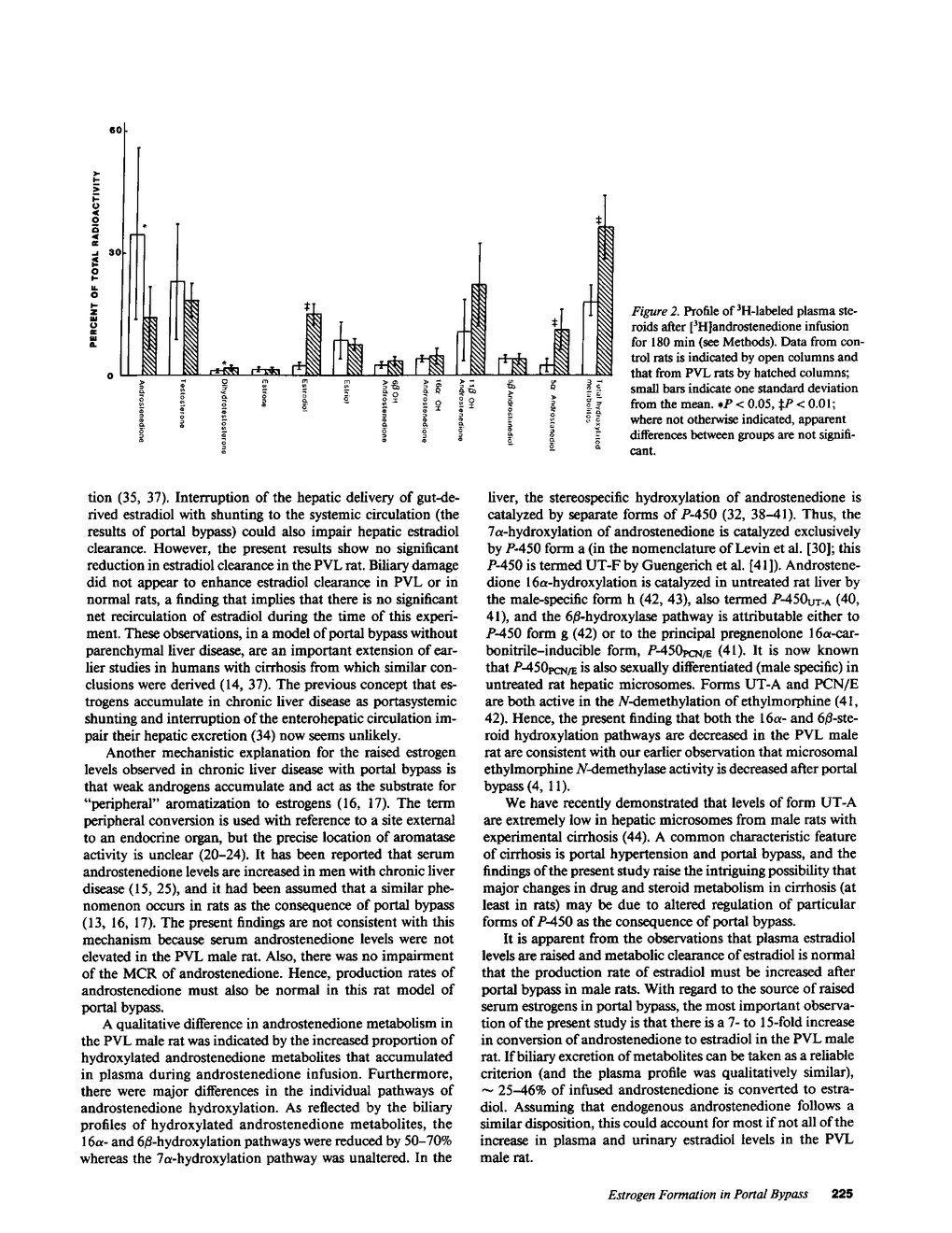 We sought to establish the mechanism for the raised serum estrogen levels that occur in male rats with portal hypertension and resultant portal bypass. Using the portal vein ligated (PVL) rat model, we evaluated plasma steroid hormone concentrations, metabolic clearance rate (MCR) of estradiol, and hepatic metabolism of androstenedione to estrogens and other products. In contrast to serum testosterone levels that were reduced, serum androstenedione levels were normal in the PVL rat. Estradiol MCR was measured by a constant intravenous infusion technique and was found to be similar in PVL and control animals. Androstenedione MCR was determined during constant intravenous infusion of [3H]androstenedione, and the resultant radiolabeled steroids present in plasma were separated by thin layer chromatography. The MCR of androstenedione was not diminished in PVL rats compared with controls. However, there was a sevenfold increase in the plasma estradiol derived from [3H]androstenedione in rats with portal bypass. Examination of radiolabel excreted in bile during infusion of [3H]androstenedione showed that 25-46% of this steroid was converted to estradiol in PVL rats compared with less than 3% in control male rats (P less than 0.001). Moreover, there was a selective reduction in the excretion of 16 alpha-hydroxyandrostenedione, a finding which suggested that the metabolism of androstenedione via this pathway was decreased. Androstenedione 16 alpha-hydroxylation is known to be catalyzed by a male-specific cytochrome P-450 isoform, P-450UT-A. We conclude that raised plasma estradiol levels after portal bypass in male rats are due to increased production rates, resulting in turn from enhanced aromatization of androstenedione to estradiol. On the basis of the observed specific changes in androstenedione hydroxylation pathways, it is proposed that alterations in levels of sex-specific forms of cytochrome P-450 occur in male rats with portal bypass and could account for the enhanced formation of estradiol.