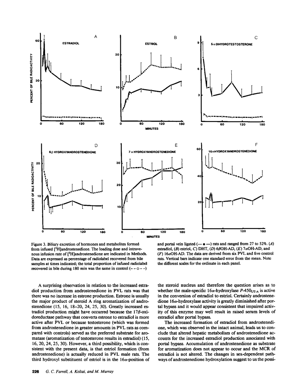We sought to establish the mechanism for the raised serum estrogen levels that occur in male rats with portal hypertension and resultant portal bypass. Using the portal vein ligated (PVL) rat model, we evaluated plasma steroid hormone concentrations, metabolic clearance rate (MCR) of estradiol, and hepatic metabolism of androstenedione to estrogens and other products. In contrast to serum testosterone levels that were reduced, serum androstenedione levels were normal in the PVL rat. Estradiol MCR was measured by a constant intravenous infusion technique and was found to be similar in PVL and control animals. Androstenedione MCR was determined during constant intravenous infusion of [3H]androstenedione, and the resultant radiolabeled steroids present in plasma were separated by thin layer chromatography. The MCR of androstenedione was not diminished in PVL rats compared with controls. However, there was a sevenfold increase in the plasma estradiol derived from [3H]androstenedione in rats with portal bypass. Examination of radiolabel excreted in bile during infusion of [3H]androstenedione showed that 25-46% of this steroid was converted to estradiol in PVL rats compared with less than 3% in control male rats (P less than 0.001). Moreover, there was a selective reduction in the excretion of 16 alpha-hydroxyandrostenedione, a finding which suggested that the metabolism of androstenedione via this pathway was decreased. Androstenedione 16 alpha-hydroxylation is known to be catalyzed by a male-specific cytochrome P-450 isoform, P-450UT-A. We conclude that raised plasma estradiol levels after portal bypass in male rats are due to increased production rates, resulting in turn from enhanced aromatization of androstenedione to estradiol. On the basis of the observed specific changes in androstenedione hydroxylation pathways, it is proposed that alterations in levels of sex-specific forms of cytochrome P-450 occur in male rats with portal bypass and could account for the enhanced formation of estradiol.