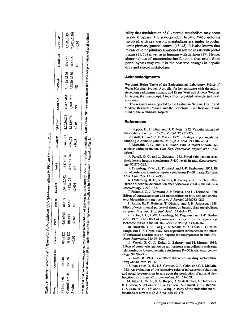 We sought to establish the mechanism for the raised serum estrogen levels that occur in male rats with portal hypertension and resultant portal bypass. Using the portal vein ligated (PVL) rat model, we evaluated plasma steroid hormone concentrations, metabolic clearance rate (MCR) of estradiol, and hepatic metabolism of androstenedione to estrogens and other products. In contrast to serum testosterone levels that were reduced, serum androstenedione levels were normal in the PVL rat. Estradiol MCR was measured by a constant intravenous infusion technique and was found to be similar in PVL and control animals. Androstenedione MCR was determined during constant intravenous infusion of [3H]androstenedione, and the resultant radiolabeled steroids present in plasma were separated by thin layer chromatography. The MCR of androstenedione was not diminished in PVL rats compared with controls. However, there was a sevenfold increase in the plasma estradiol derived from [3H]androstenedione in rats with portal bypass. Examination of radiolabel excreted in bile during infusion of [3H]androstenedione showed that 25-46% of this steroid was converted to estradiol in PVL rats compared with less than 3% in control male rats (P less than 0.001). Moreover, there was a selective reduction in the excretion of 16 alpha-hydroxyandrostenedione, a finding which suggested that the metabolism of androstenedione via this pathway was decreased. Androstenedione 16 alpha-hydroxylation is known to be catalyzed by a male-specific cytochrome P-450 isoform, P-450UT-A. We conclude that raised plasma estradiol levels after portal bypass in male rats are due to increased production rates, resulting in turn from enhanced aromatization of androstenedione to estradiol. On the basis of the observed specific changes in androstenedione hydroxylation pathways, it is proposed that alterations in levels of sex-specific forms of cytochrome P-450 occur in male rats with portal bypass and could account for the enhanced formation of estradiol.